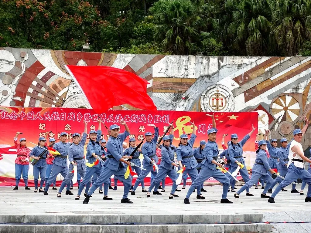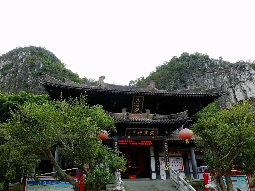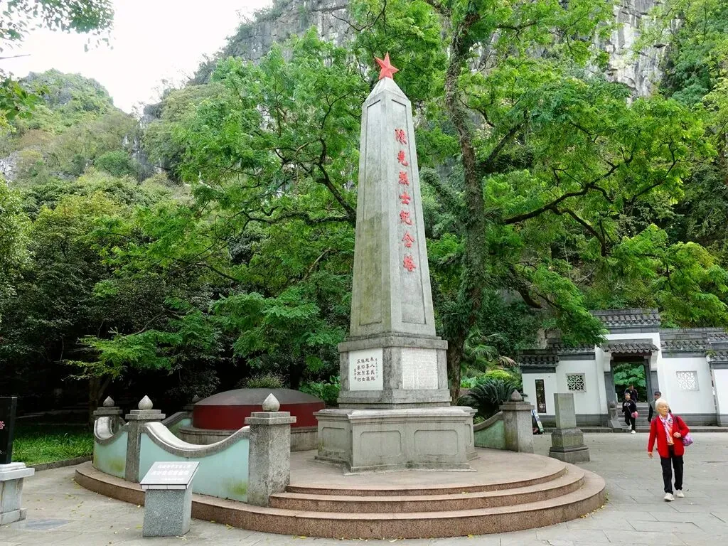 从栖霞大门进入七星景区,映入眼帘的就是始建于唐代的栖霞古寺,栖霞禅寺,历经沧桑,几度重建,是桂林古名寺。匾额为原中国佛教协会会长赵朴初先生手迹,寺庙设天王殿、大雄宝殿、观音殿、藏经阁和钟鼓楼等。人们在英雄纪念碑下散步和运动,广场上正在举办纪念抗日战争80周年的文艺演出。