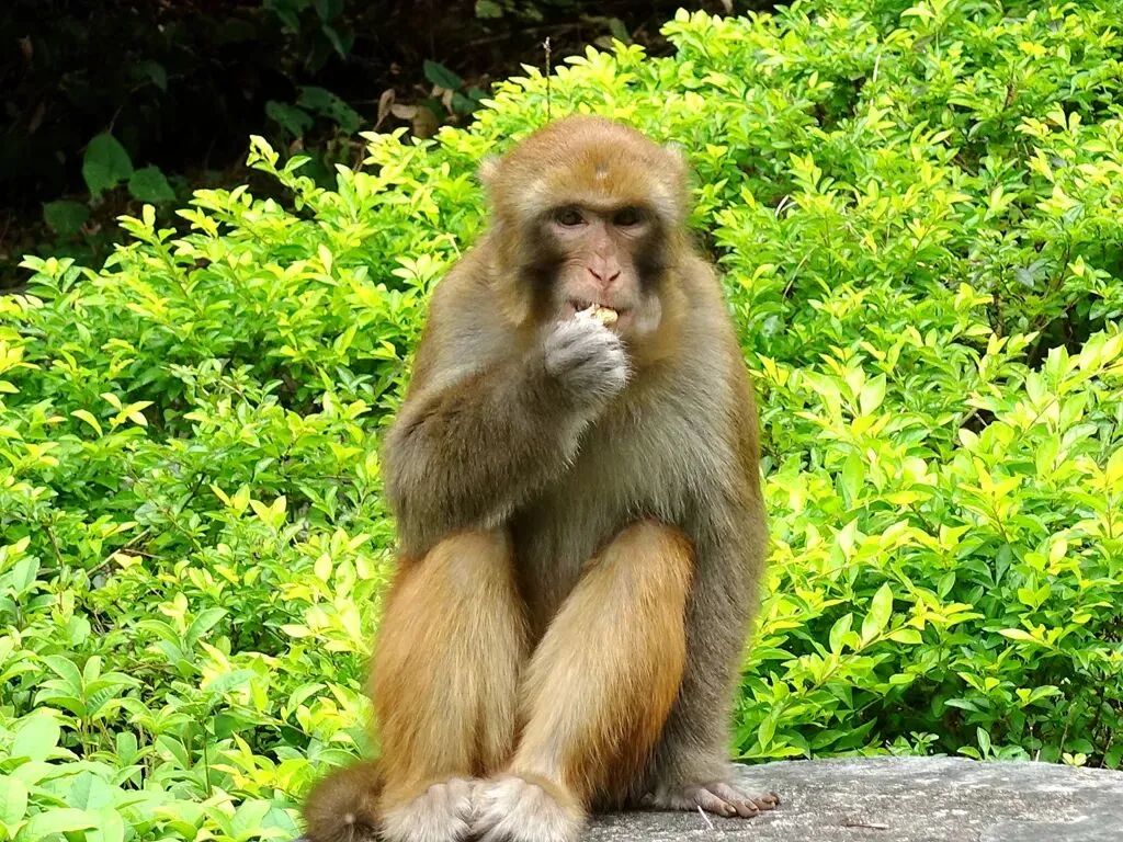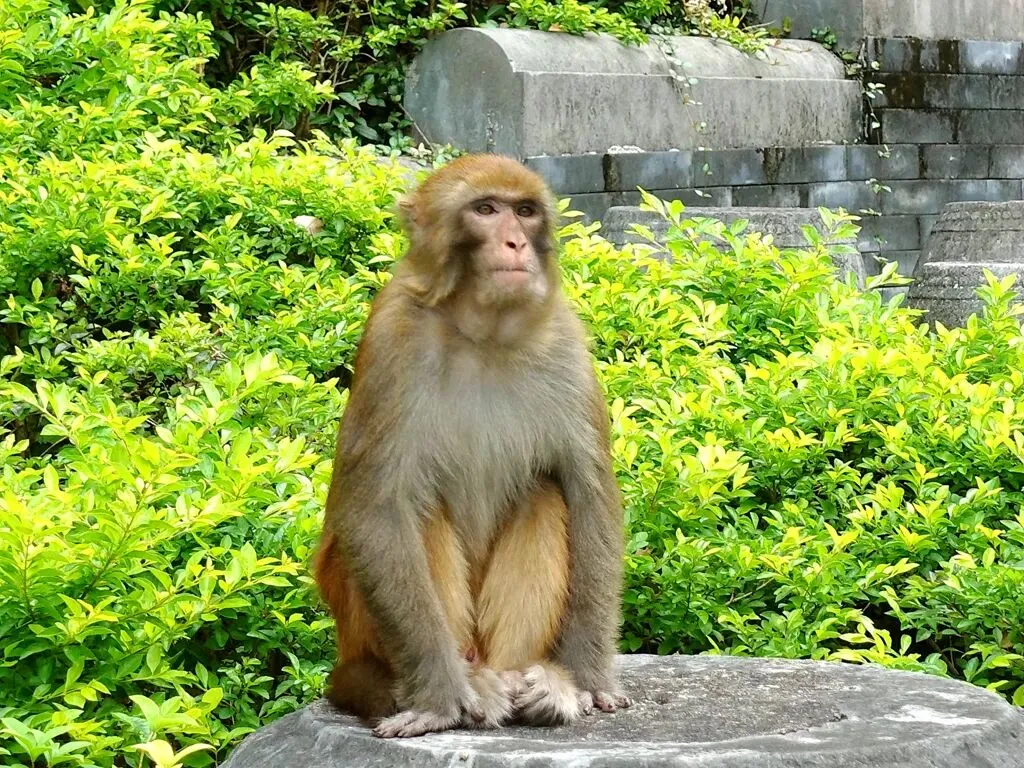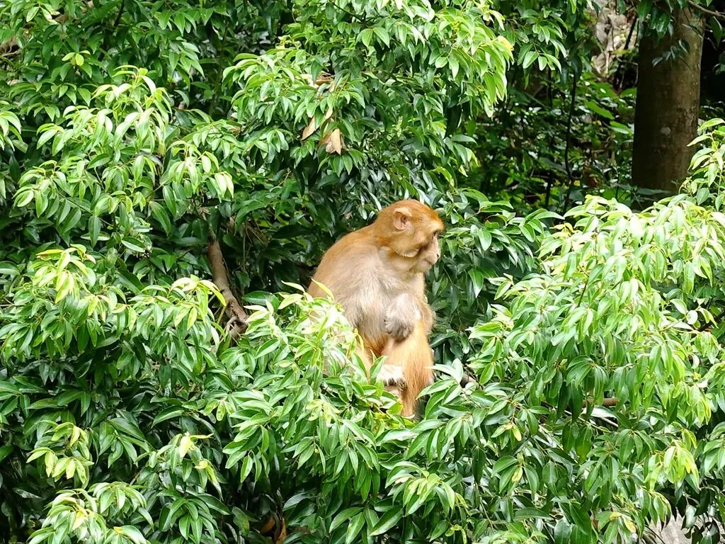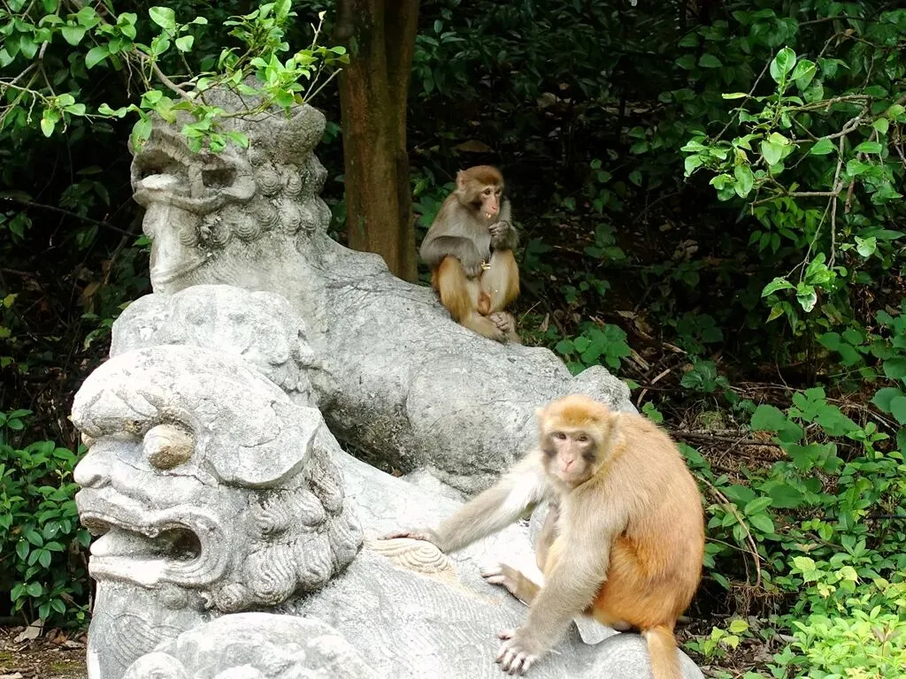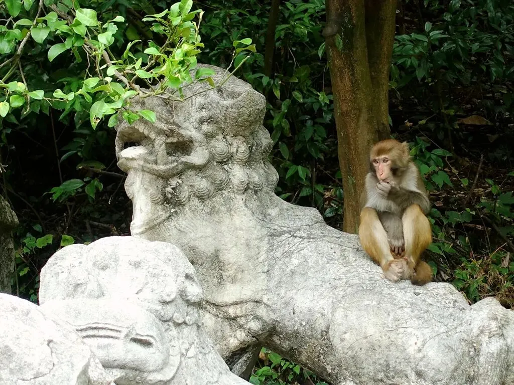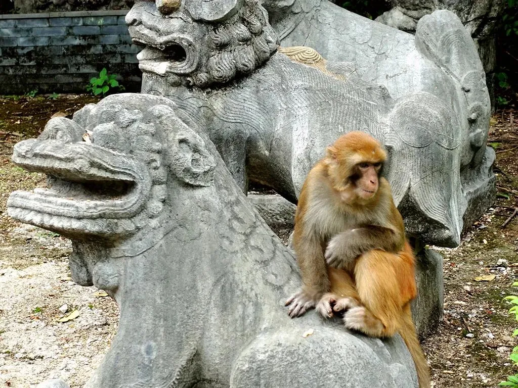 正当我遐想之际,树枝突然抖动了起来,一只可爱的金毛猴子,从树上跳下来蹲在石墩子上面,幸好进门的适合买了喂猴子的花生,赶紧丢过去给它尝尝,结果引来树林里的猴群,它们或挂在树枝上摇荡,或蹲坐在石头狮子的头上背上,引来附近游客围观和拍照,它们很呆萌很可爱,这也是游览中的意外惊喜。继续往前走就到了标志性景点骆驼山,真的非常像头骆驼,随后从驼峰大门离开,返回酒店吃饭午睡。