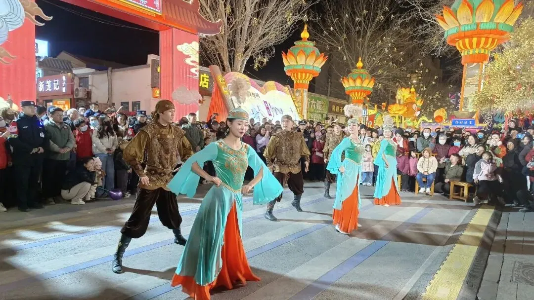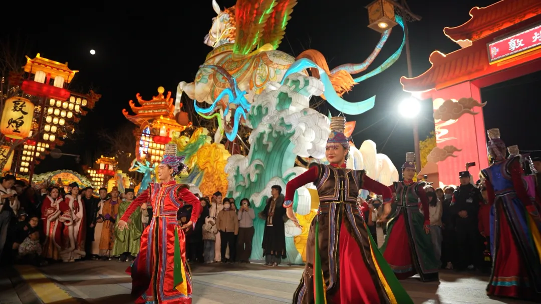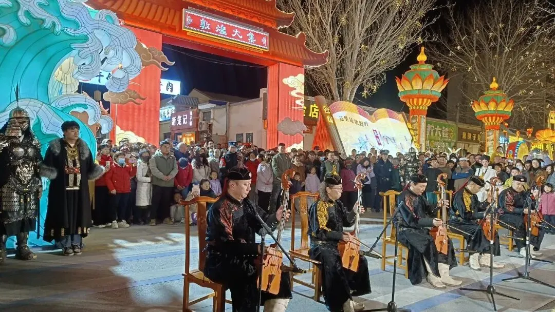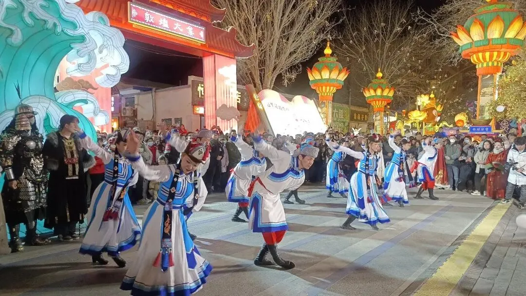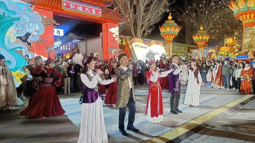 三地紧紧围绕大敦煌文化旅游经济圈资源整合、区域协同发展部署,将肃北、阿克塞浓郁的牧区风情、民族歌舞、民俗文化,与敦煌乐舞、敦煌灯会等特色文旅场景深度衔接、有机融合。活动紧扣“丝路携手民族情”主线,以文艺展演为鲜活载体,扎实推进旅游促进各民族交往交流交融实践。璀璨灯会之下,阿克塞民族歌舞团、肃北乌兰牧骑轮番亮相,近70名演职人员以奔放舞姿、嘹亮歌声,将草原牧区的辽阔豪迈与丝路敦煌的典雅气韵交织共鸣、相映生辉。民族歌舞热情洋溢,独唱曲目深情婉转,马头琴合奏气势恢宏,冬不拉轻快欢腾,从群舞到独唱、从传统器乐到现代表达,多元艺术形式轮番呈现,让现场群众沉浸式感受民族文化的独特魅力与交融之美。