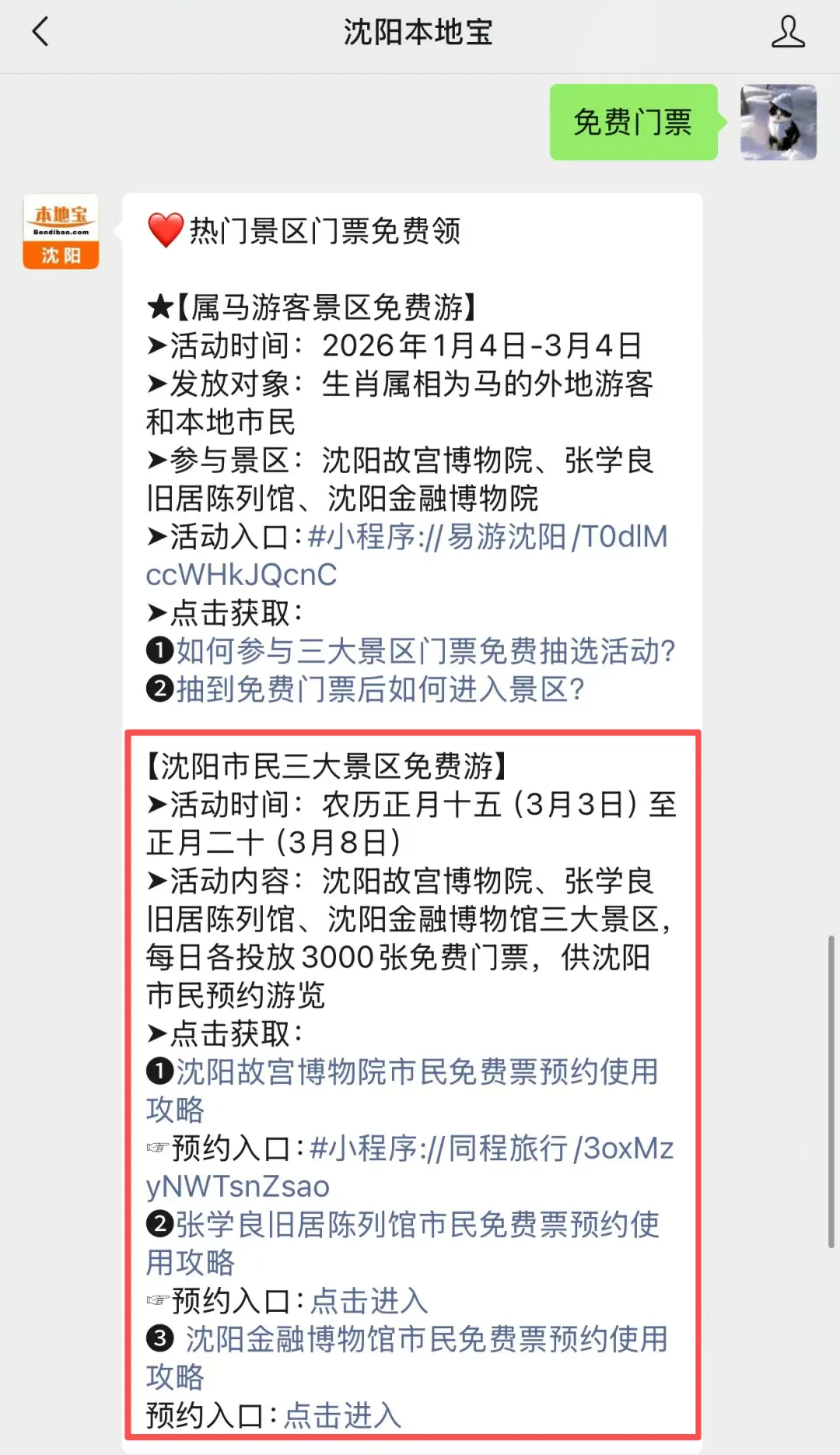 回复【免费门票】获取沈阳热门景区免费门票活动安排