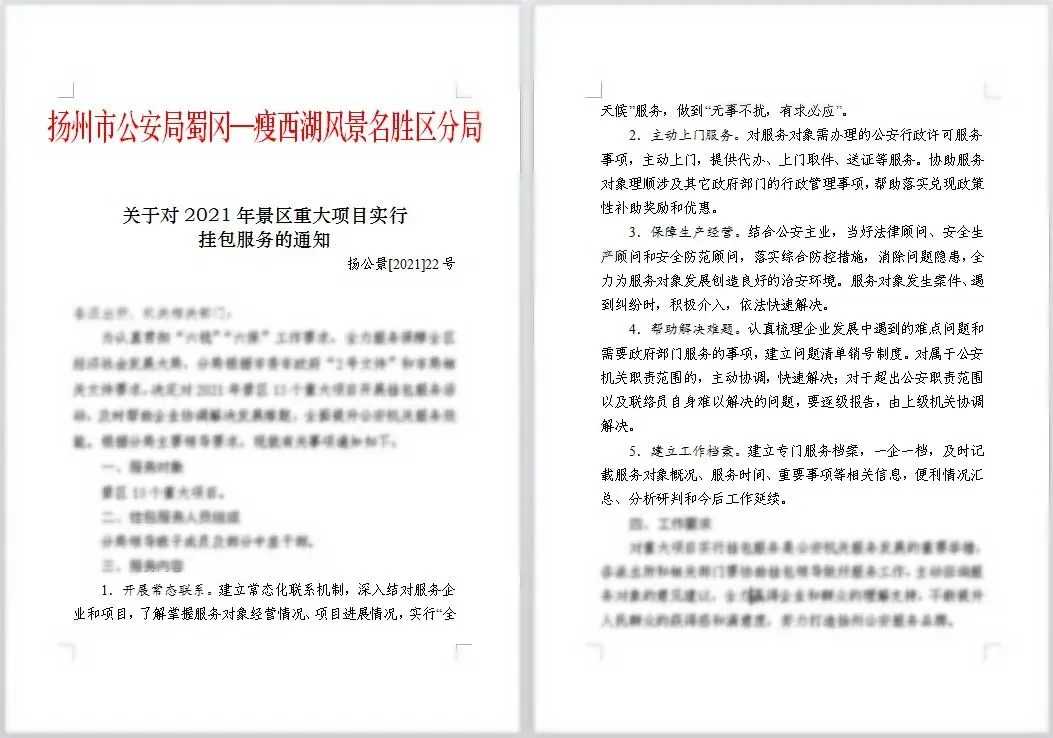 近年,扬州中国大运河博物馆、华侨城等一批重大项目相继在蜀冈-瘦西湖风景名胜区落地。为全力服务保障全区经济社会发展大局,景区公安分局根据市委市政府“2号文件”和市局相关工作要求制定下发文件,对2021年景区15个重大项目开展挂包服务活动。