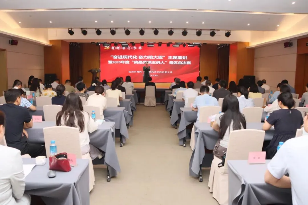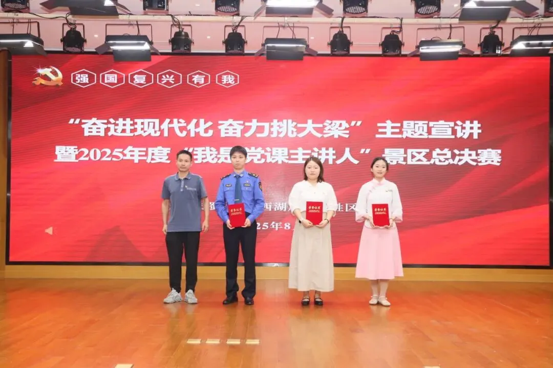 为持续推动学习宣传贯彻习近平新时代中国特色社会主义思想走深走实走心,引导全区上下更加自觉地用党的创新理论武装头脑、指导实践、推动工作,奋力推进中国式现代化景区新实践,8月5日下午,景区举办“奋进现代化 奋力挑大梁”主题宣讲暨2025年度“我是党课主讲人”总决赛。景区党工委副书记洪扬,景区纪工委书记刘咏,景区党工委委员、党群工作部部长刘年年,市委宣传部理论处处长王振祥,市委组织部组织处副处长陆智成担任评委。