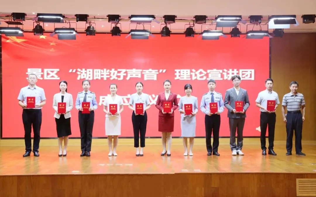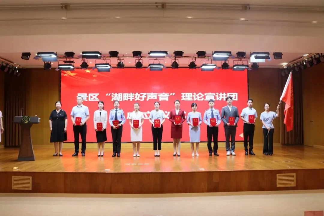 活动最后,景区还举办了“湖畔好声音”理论宣讲团成立仪式。刘咏为“湖畔好声音”理论宣讲团首批成员颁发聘书,洪扬为“湖畔好声音”理论宣讲团授旗。以“优秀党课主讲人”为宣讲骨干的景区“湖畔好声音”理论宣讲团的正式成立,标志着景区“1+4+N”的宣讲队伍矩阵初步建构完成。覆盖区、乡(街道)、村(社区)三级的宣讲队伍建设,将创新传播党的“好声音”,持续唱响时代“主旋律”,有力助推景区基层理论宣讲工作开启新的征程。