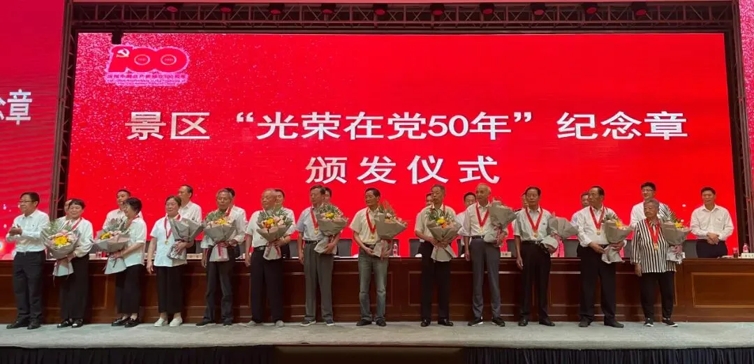 100年风雨兼程,100年砥砺前行。6月29日下午,景区庆祝建党100周年暨基层党建重点工作推进会在虹桥坊会议中心隆重举行。对全区优秀共产党员、优秀党务工作者和先进基层党组织进行表彰,为老党员代表颁发“光荣在党50年”纪念章。