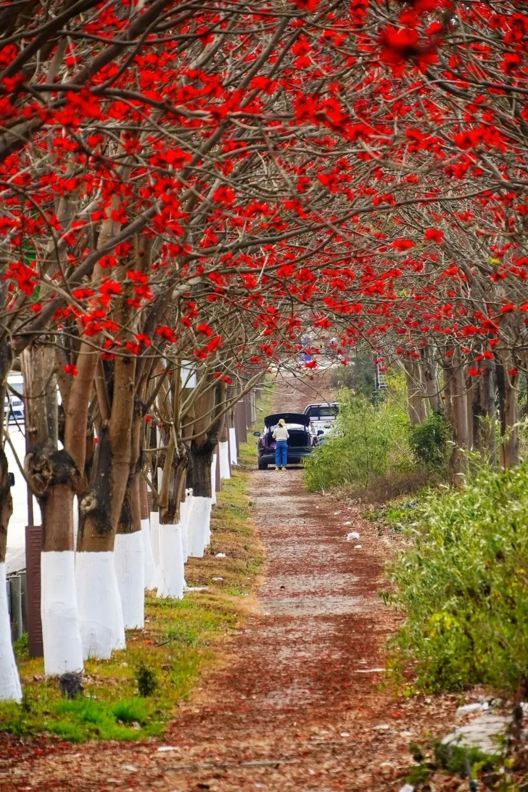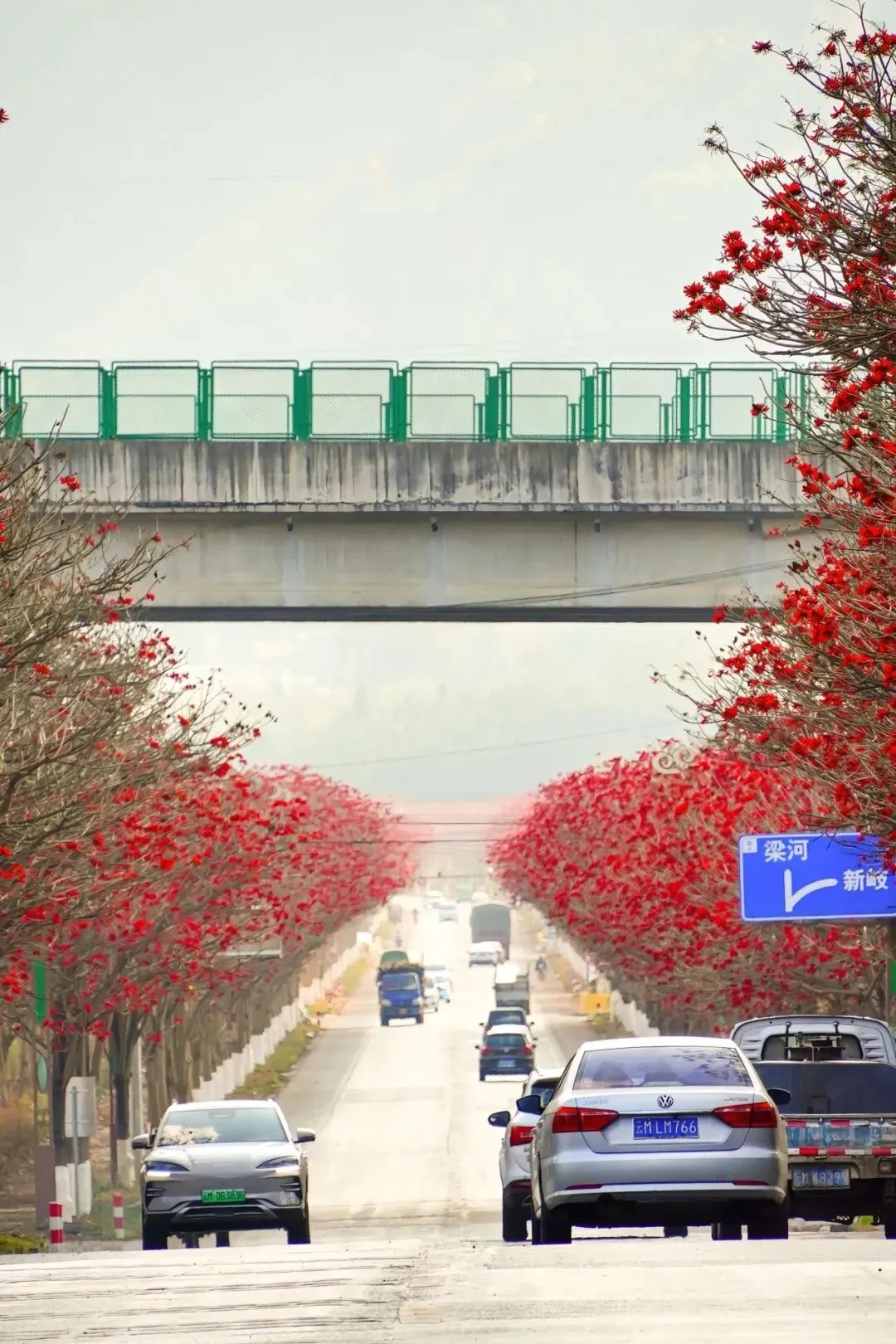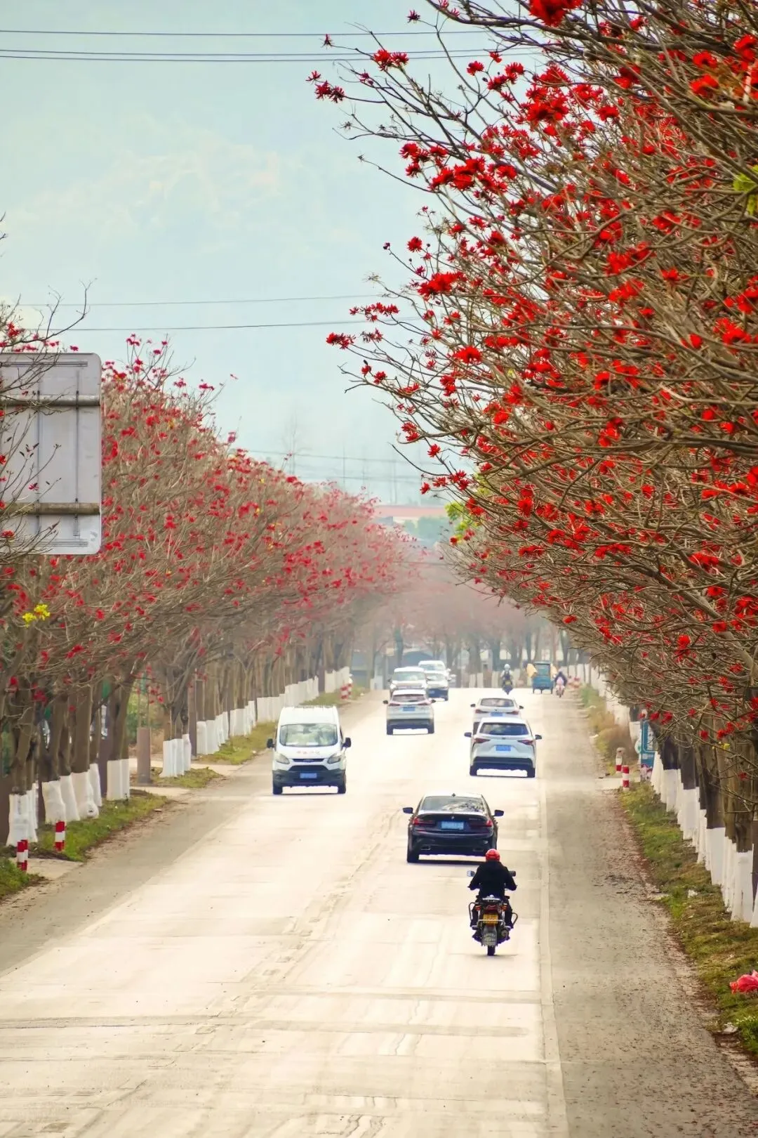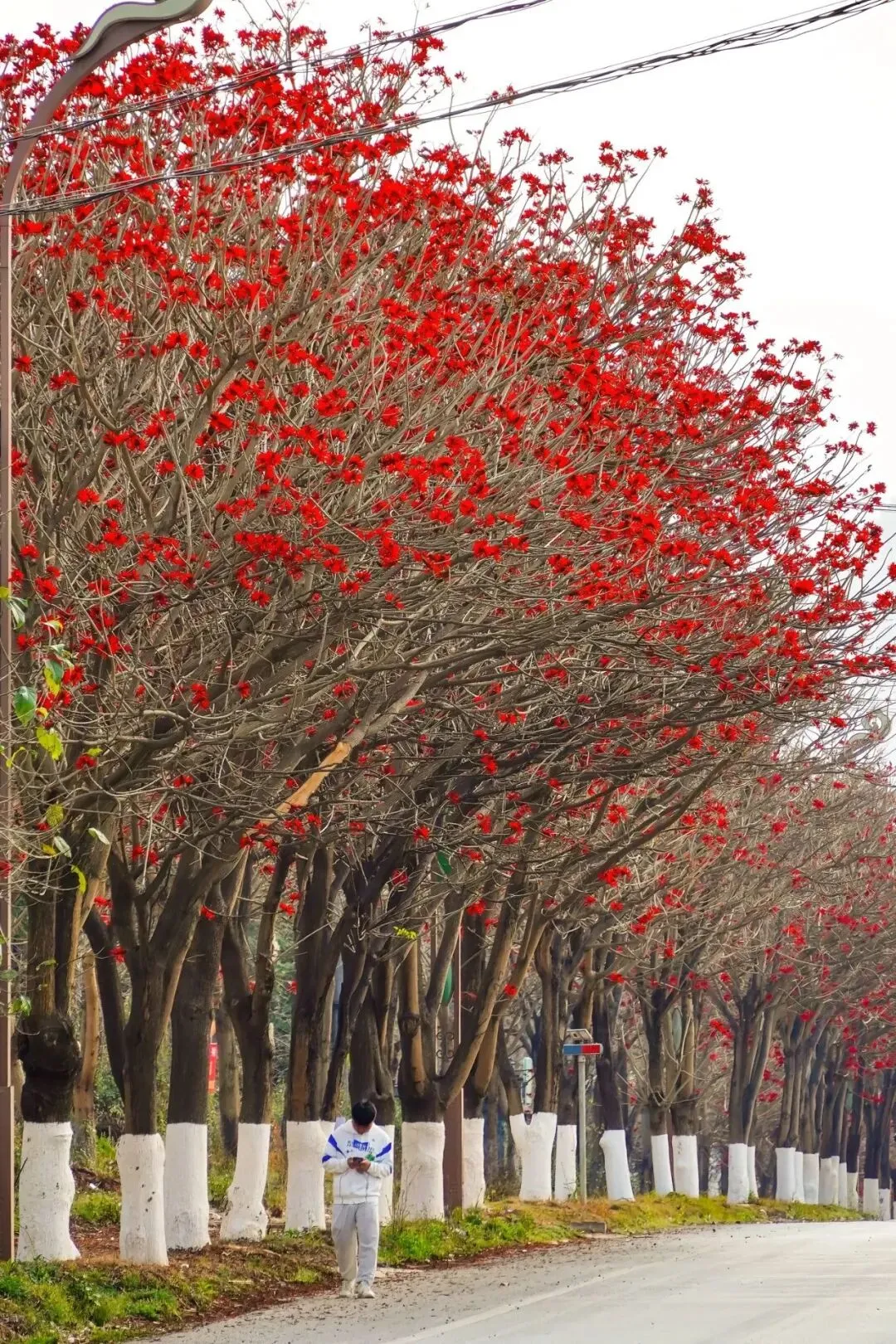动人的是傍晚。夕阳把天空染成蜜色时,马路边的刺桐花像被镀了层金,暖得发烫。下班的人骑着车,影子被路灯拉得很长,花树与路灯交错,在路面织出斑驳的光影;赶路的司机也会下意识减速,透过车窗看一眼那片火红,仿佛一天的疲惫都被这热烈的颜色焐化了几分。