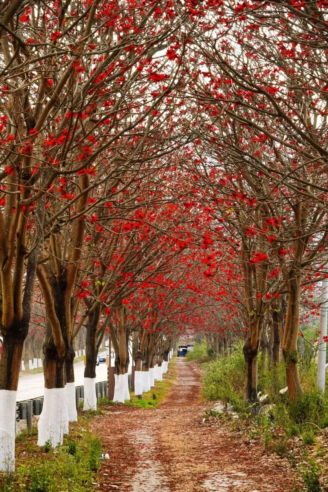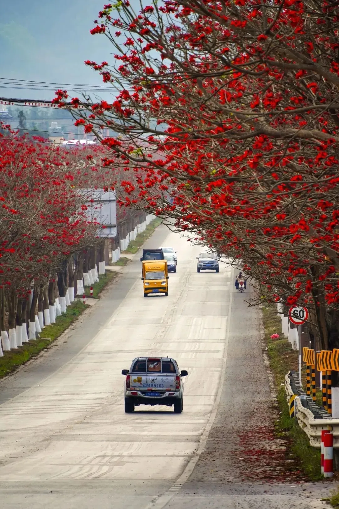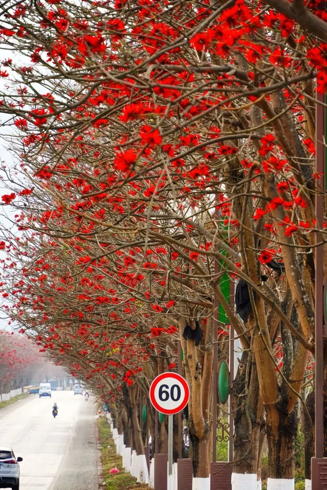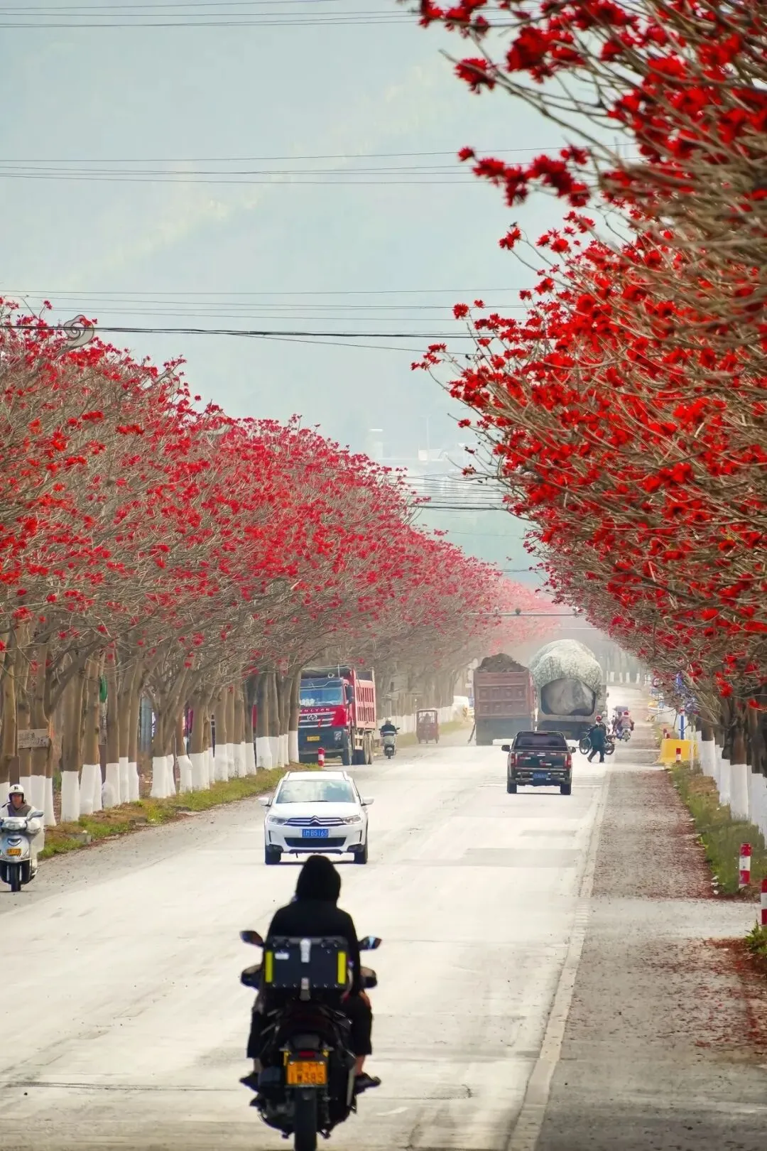 动人的是傍晚。夕阳把天空染成蜜色时,马路边的刺桐花像被镀了层金,暖得发烫。下班的人骑着车,影子被路灯拉得很长,花树与路灯交错,在路面织出斑驳的光影;赶路的司机也会下意识减速,透过车窗看一眼那片火红,仿佛一天的疲惫都被这热烈的颜色焐化了几分。
