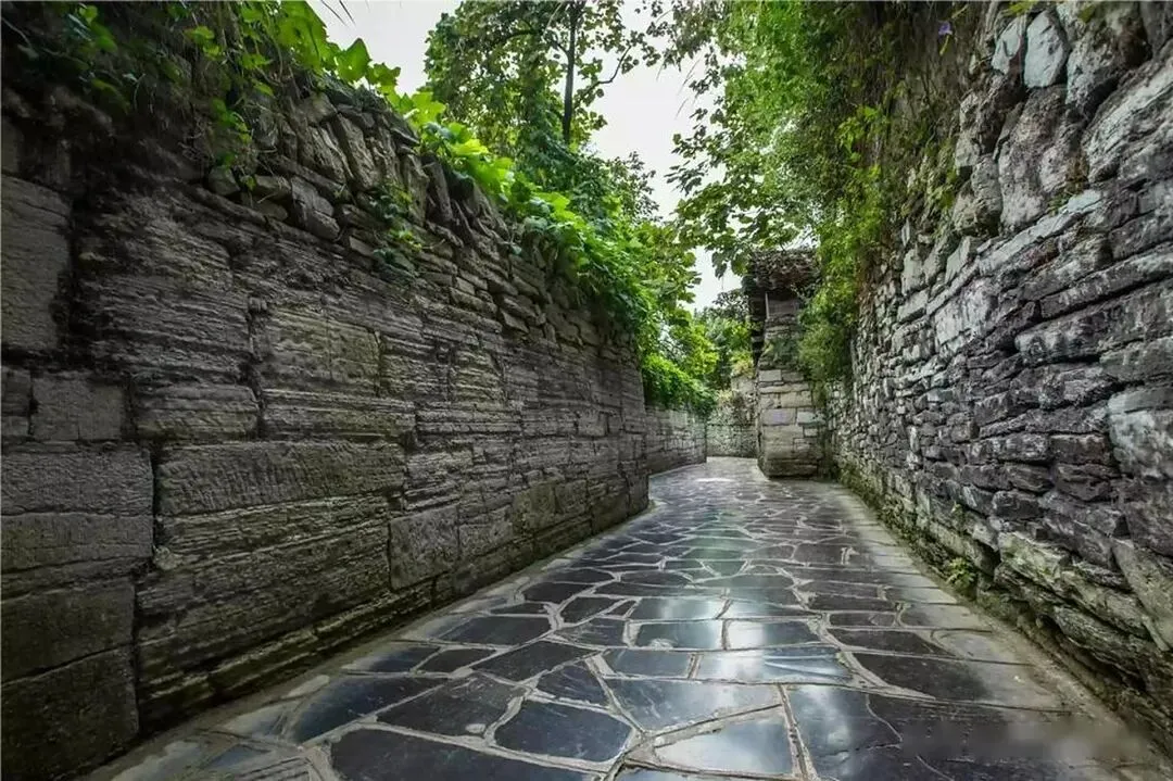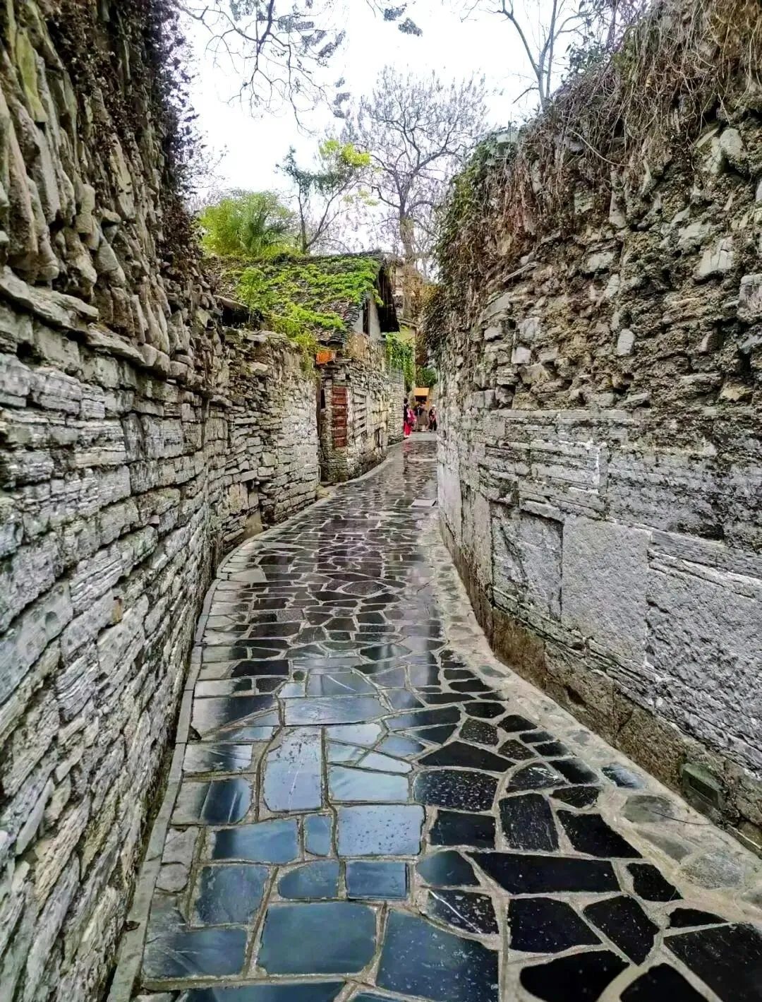 这条幽静的小巷由当地特有的页岩层层堆砌而成,墙体用条石、块石、团石和不规则石块以糯米浆、桐油、石灰粘合砌筑,页岩的特色形态使石巷的细部纹理十分丰富,青石板路被岁月磨得光可鉴人,泛着温润的光泽。