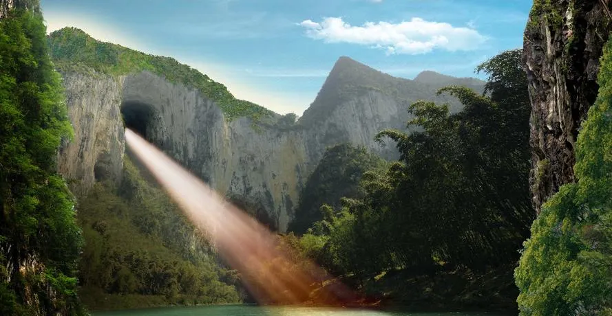 格凸河这地方属于紫云县,但从西秀区出发很方便,这里最大的看点是峡谷和洞穴形成的立体景观。你坐船进去,两边山壁直上直下,水道窄到只能过一条船,然后突然就进了一个巨大的溶洞,洞顶有天然形成的天窗,光线从上面打下来,整个空间的氛围一下就变了,这种从压迫到释放的转换,是设计师费尽心思也搞不出来的效果。
