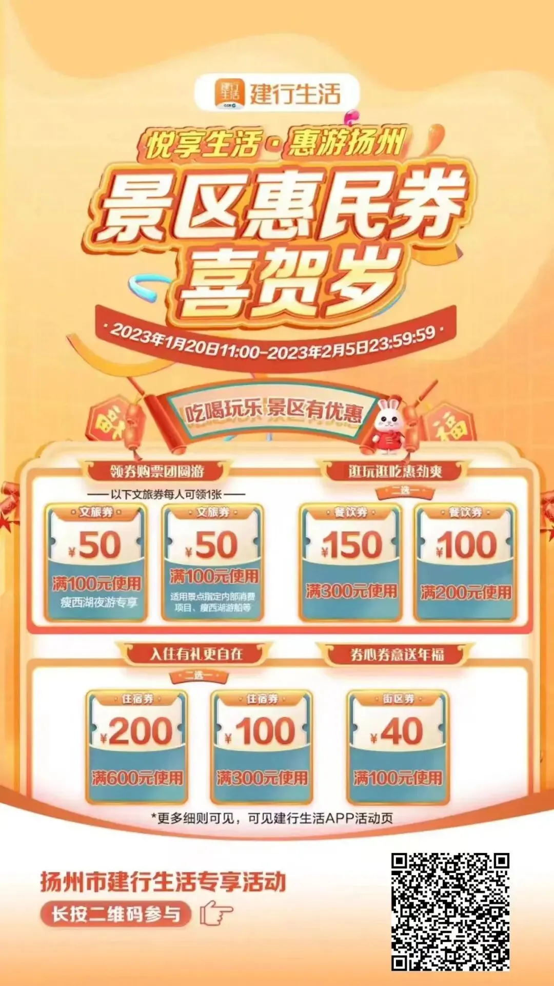 如何抢?扫码下载建行生活APP,完成注册绑卡(不限建行卡)。在首页,本地优惠,通过”景区惠民券.喜贺岁”活动页面领取。