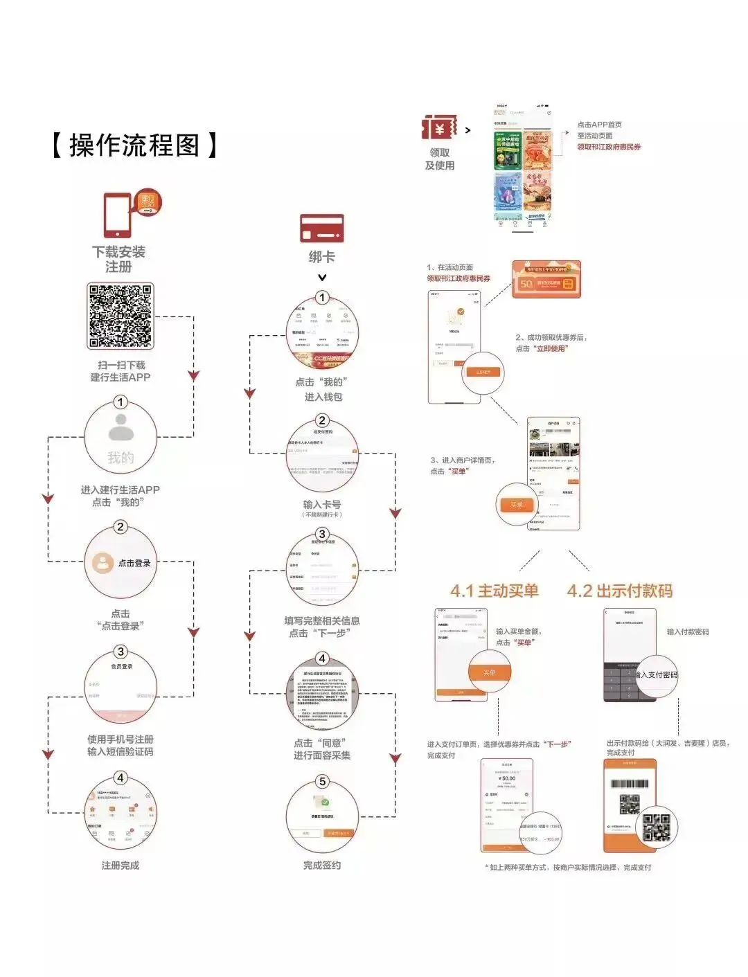 如何使用?到优惠券使用商户收银处,使用建行生活APP出示付款码或者主动买单,满足条件的付款,自动核销惠民券。