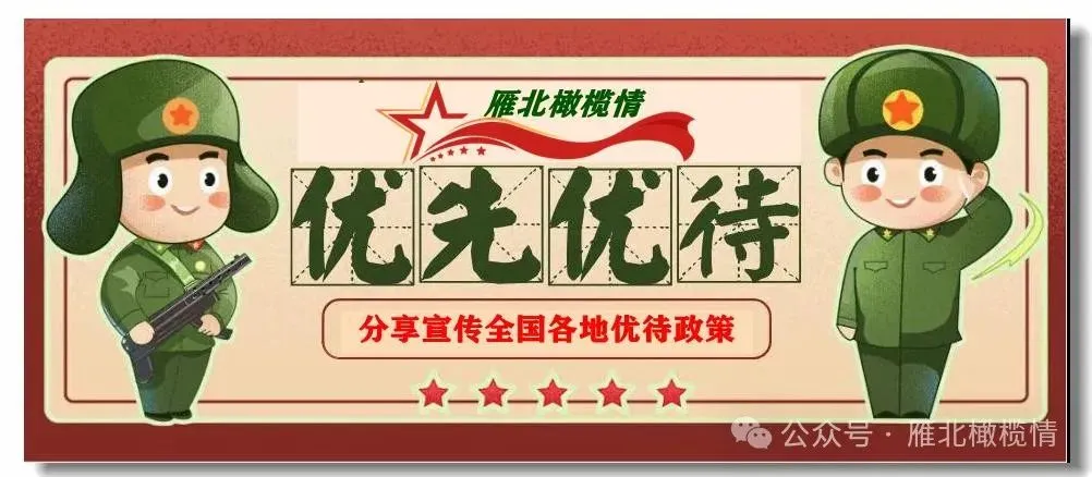 我们点赞天津市退役军人事务部门,点赞为优待证持证人,提供优质服务的景点景区。实际上近年来老战友们也看到了,全国各地的优待政策,从省级目录到市级清单都在不断地更新。各类拥军优待举措落实落地掷地有声,为满足退役军人需求的优待项目不断“上新”,从公共交通到医疗健康、从文旅出行到生活服务,广大军人、军属、退役军人和其他优抚对象。在日常生活场景中,着实是感受到了实实在在的尊崇。战友们所在的地区,有哪些优待政策和好的做法,欢迎在评论区我们一起交流!一直以来承蒙老战友们,给予《雁北橄榄情》公众号的大力支持,作为本公众号主编,在此表示衷心的感谢!谢谢!