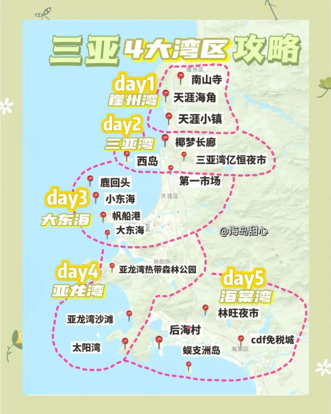 三亚市位于海南岛最南端,东西走向的长条形状。它的热门景点也大致沿着海岸线分布在几个海湾里。