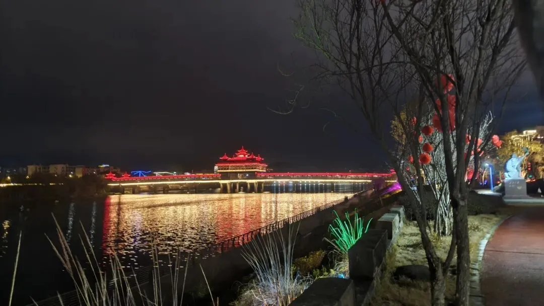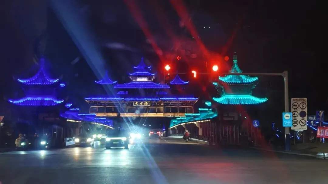 第四站文峰桥。文峰桥搭着夜晚的灯光非常好看,灯光颜色不时变换下,别有一番风味。不得不说,黄山晚上的灯光打得是真漂亮。沿着这个新安江边,有非常多绚丽的灯光夜景。夏天的时候坐游船在江里欣赏两岸的风景肯定是非常漂亮的。