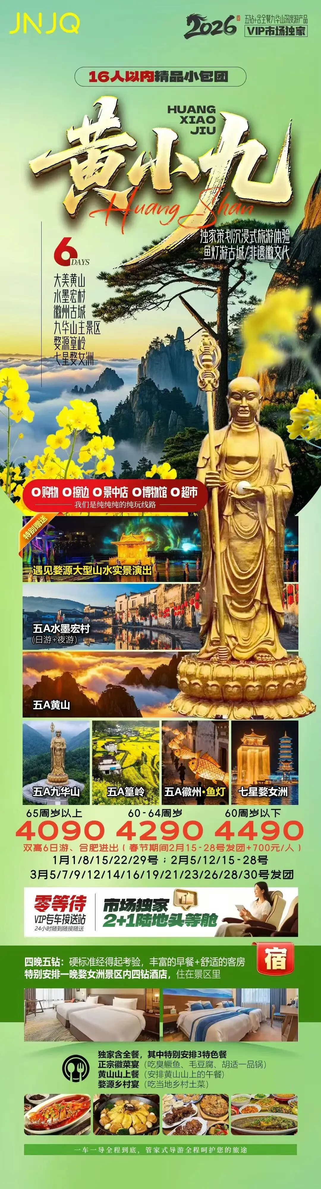 黄山|【相遇•徽州】 👏精粹|精品VIP12人·真纯玩‼ 🚌品质|双高往返尊贵座 🏨酒店|黄山市区4钻酒店·四晚连住不挪窝 🈶️美食|徽州臭鳜鱼宴·毛豆腐·徽州喜宴 🈵️味蕾|地道徽菜传统宴🍲 🥇赠送|登山手杖·每日暖心矿泉水 🎁赠送|必看新安江《渔风千古情》实景演出·夜游屯溪河街 🌈一价|0购物0套路0擦边0猫腻 🌈纯玩|核心景区门票全含·缆车景交自愿选择