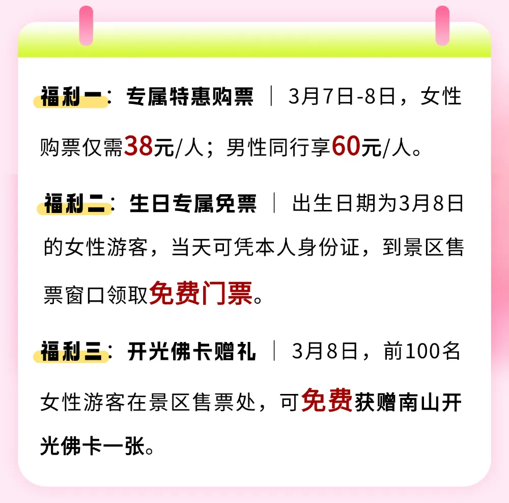 不负春日,不负卿。南山旅游景区特备三重惊喜福利,把最真挚的敬意,送给每一位了不起的您,让这个节日更有仪式感!✨