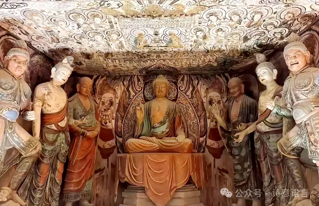俗称千佛洞,坐落在河西走廊西端的敦煌。它始建于十六国的前秦时期,历经十六国、北朝、隋、唐、五代、西夏、元等历代的兴建,形成巨大的规模,有洞窟735个,壁画4.5万平方米、泥质彩塑2415尊,是世界上现存规模最大、内容最丰富的佛教艺术地。莫高窟的壁画题材广泛,内容丰富,包括佛教故事、经变图、飞天、供养人等,色彩鲜艳,线条流畅,具有极高的艺术价值。
