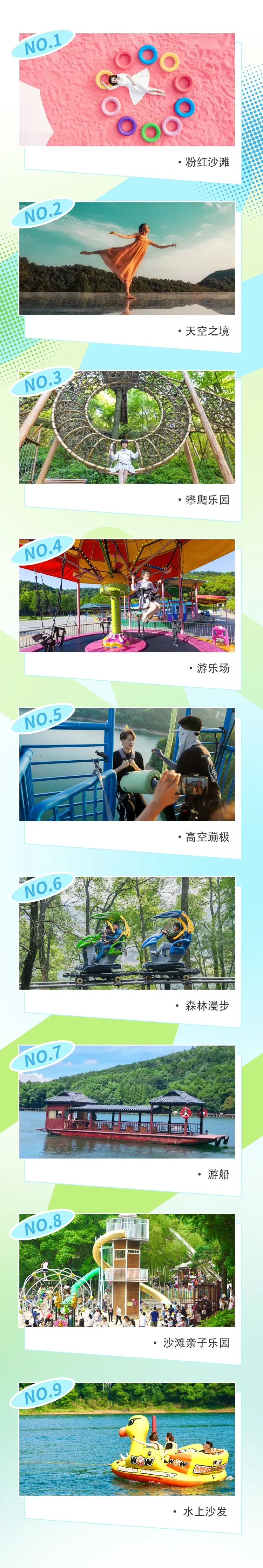 北门入园检票➡️乘坐游船游湖➡️玻璃桥➡️关云桥➡️空中栈道➡️藤桥➡️天空之镜➡️天街➡️沙滩亲子乐园➡️游览车站点➡️粉红沙滩➡️游乐场➡️丛林穿越➡️愉快返程