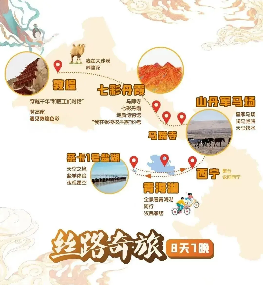 4大稀缺体验:“天马群饮水奇观”、“我在张掖挖丹霞”、“我在大漠养骆驼”、“我在茶卡采湖盐”;