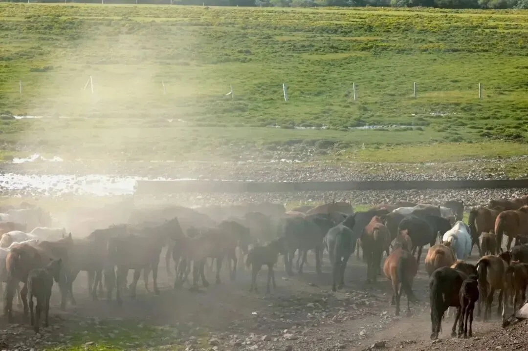 柔和的阳光洒在如茵草甸上,成群的骏马或走或停,十分壮观。“天马”这一气势磅礴的文化意象仿佛正从历史中走来。