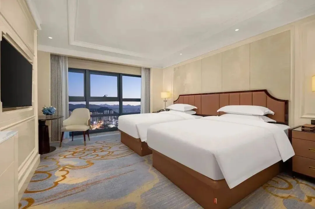 房间格调高雅,大大落地窗可远眺城市街景。