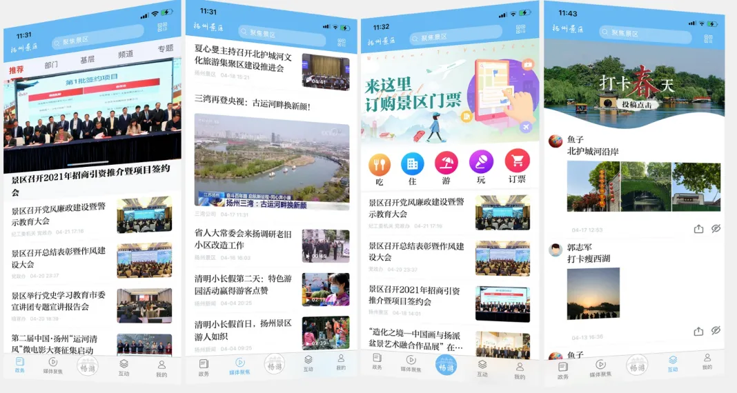 “扬州景区”APP内设“畅游”版块为核心内容,为游客提供吃、住、游、玩、订票等全环节的信息和下单通道。APP开设政务频道,设置了媒体聚焦与互动版块,多样化提升景区融媒产品。
