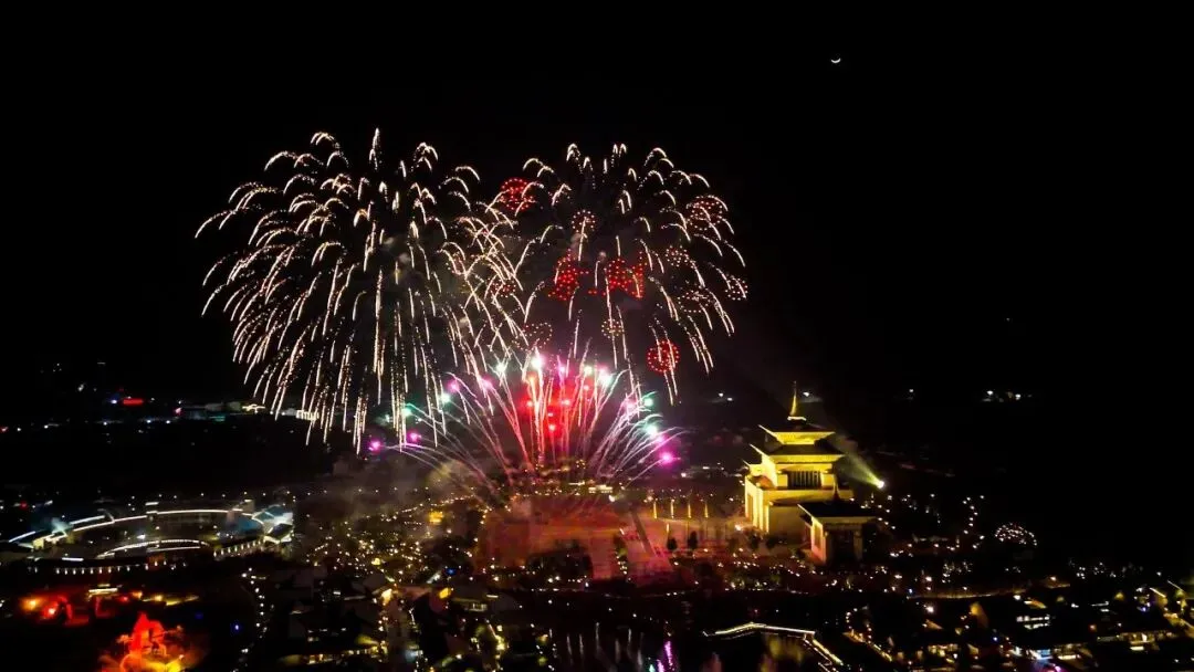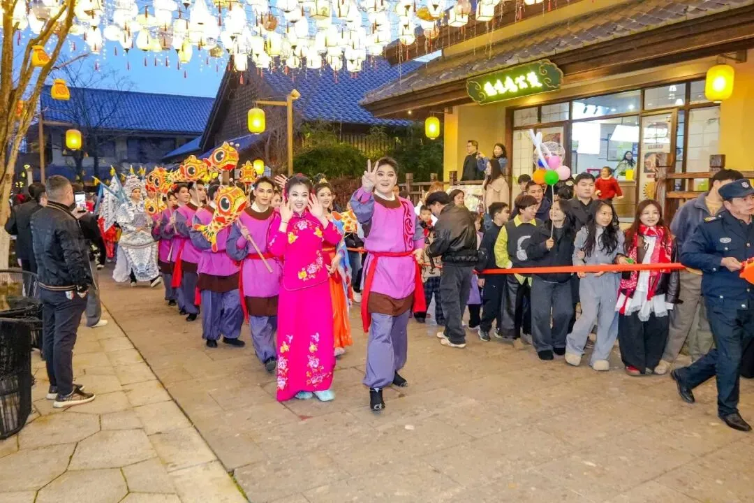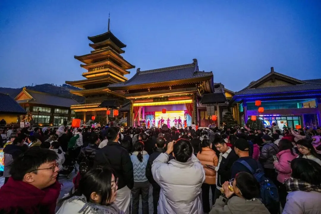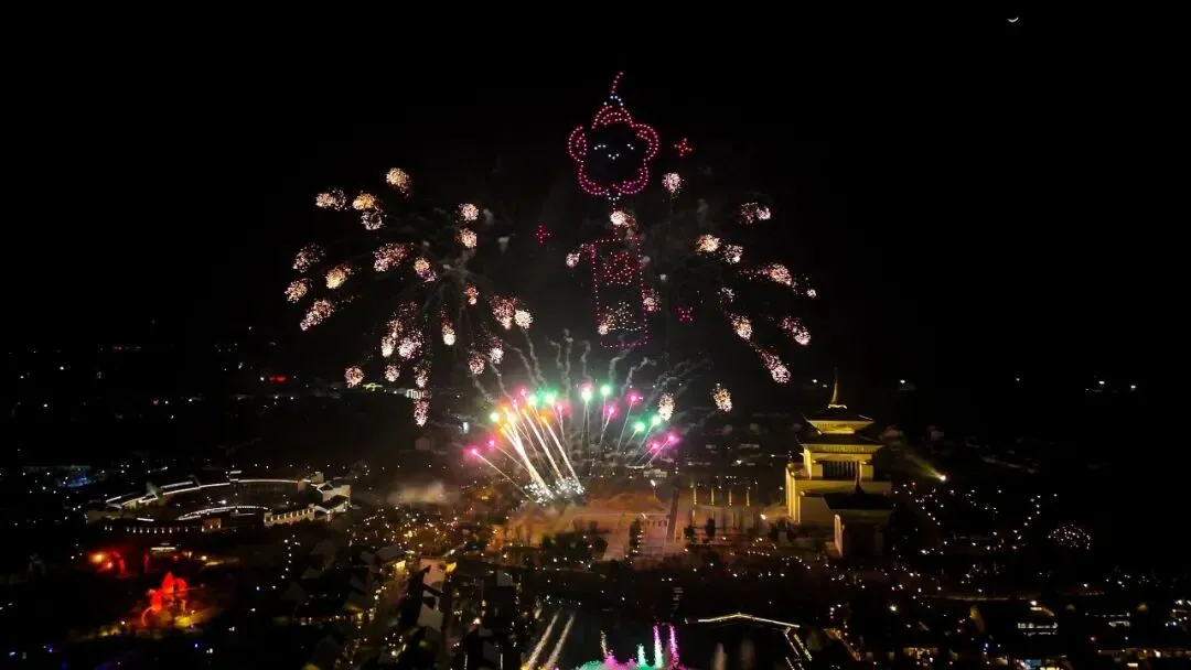 在景区大戏台,由湖北省戏曲艺术剧院青年演员带来的《小调联唱》欢乐上演,引得台下观众阵阵喝彩。夜晚数百架无人机腾空而起,以天为幕、以光为笔,不断变幻出“来财”“好运”等吉祥图景,与璀璨的焰火秀交相辉映,将节日气氛推向高潮。与此同时,一盏盏孔明灯承载着游客的美好心愿缓缓升空,与星月同辉,场面蔚为壮观。