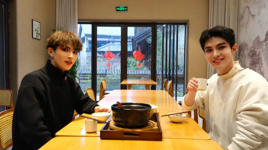 在问梅山庄,景区还为游客朋友们准备了软糯香甜的汤圆,炎黄开泰养生食疗馆内,九宫格药膳红米线备受青睐;转角处的养生茶饮馆更是人头攒动,一杯温润的草本茶饮驱散早春寒意。