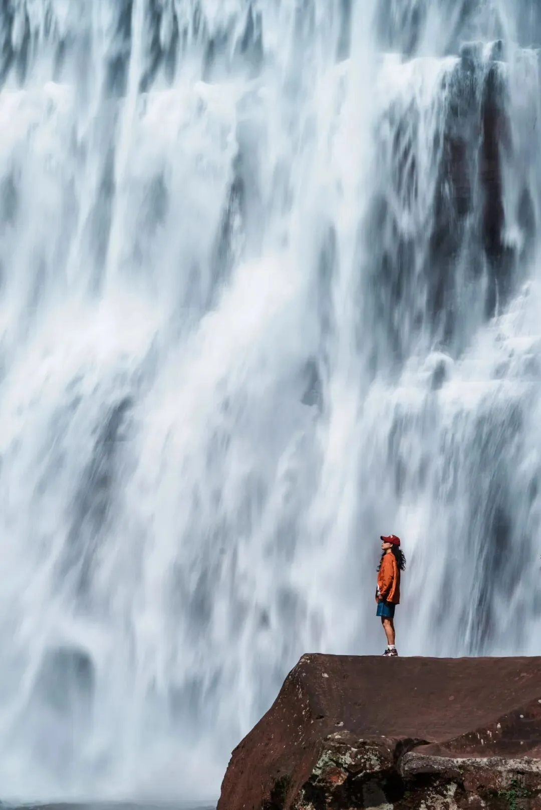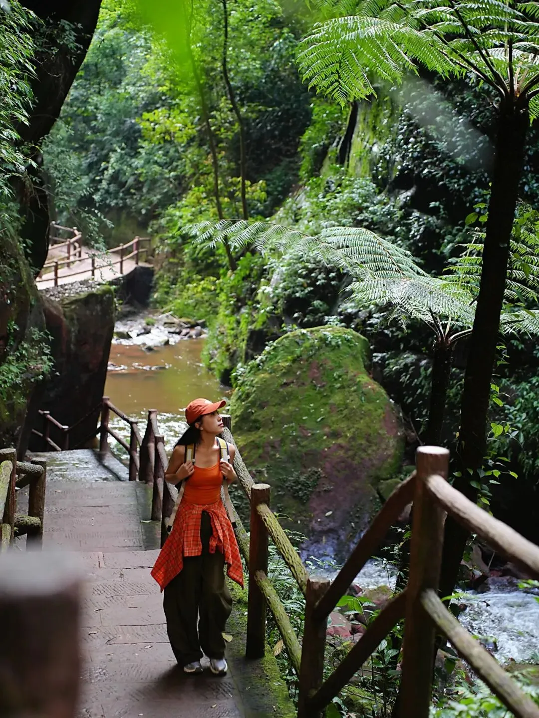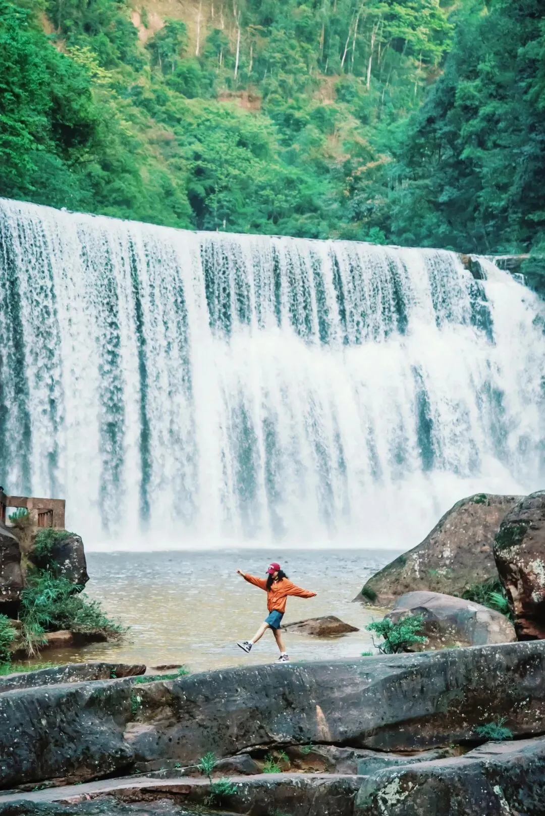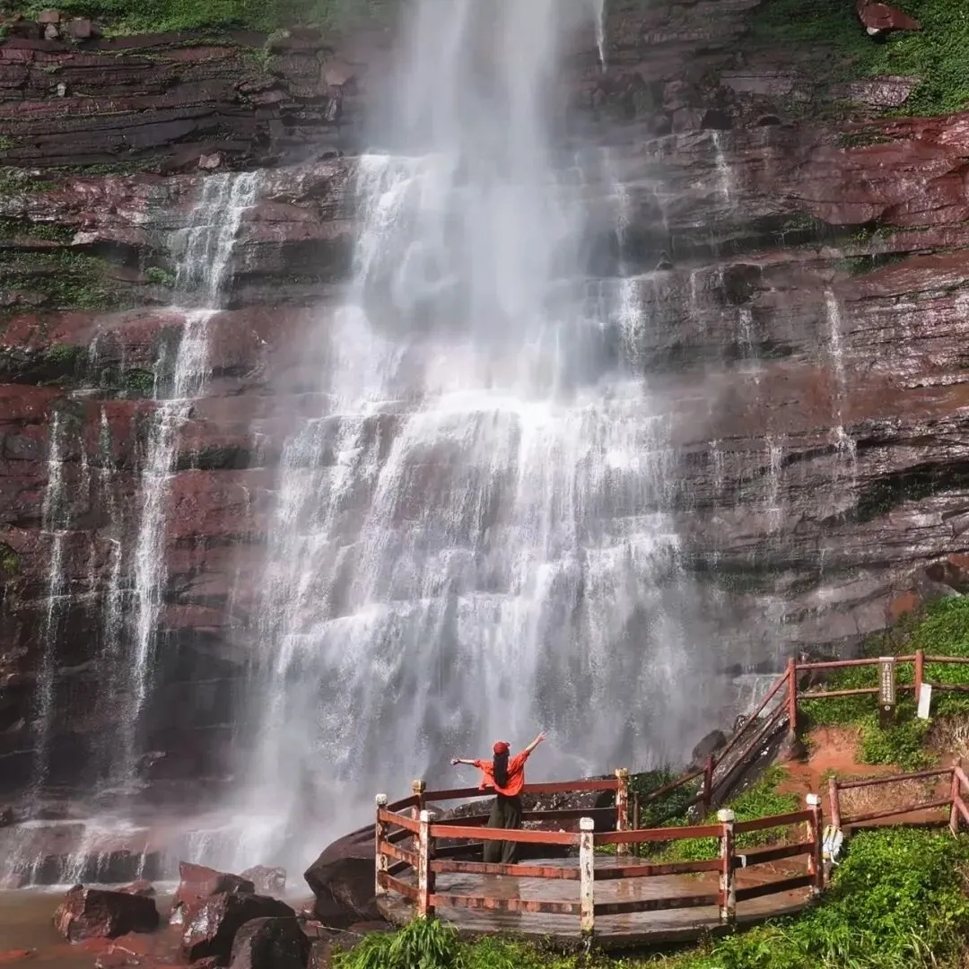 瀑布栈道 + 丹霞绝壁,行走间抓拍动态瞬间,酷飒与优雅一键切换。