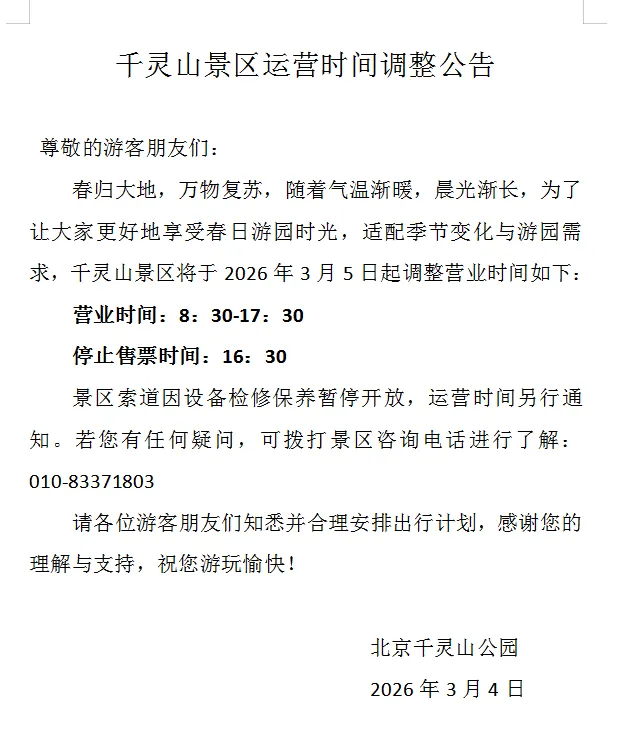 您现在的位置是:首页 > 国内旅游目的推荐 > 正文 国内旅游目的推荐 千灵山景区运营时间调整公告 admin2026年03月04日 11:48:18国内旅游目的推荐2 千灵山景区运营时间调整公告 转载请说明来源于"旅荐网",部分内容转载自网络,如有侵权请联系qlwl@foxmail.com删除 本文地址:https://www.15386.cn/post/132314.html 上一篇 昨天晚上,景区捡到几个娃...... 下一篇 桃花源景区 相关文章 洛阳多家景区官宣:免票、半价! 滏阳河进入结冰期!衡水市滏阳河景区管理中心发布安全提示→ 快来看,妇女节期间,山西多景区对女性游客免门票! 景区致春节假期广大游客的温馨提示 桃花源景区 昨天晚上,景区捡到几个娃...... 迎接三八妇女节!这些景区面向全球女士免费 好戏进景区,喜乐闹元宵! 新闻记者证与摄影采访证 景区通行误区解读 景区党工委巡察工作领导小组督查指导第一轮巡察工作 发表评论 取消回复 评论列表 这篇文章还没有收到评论,赶紧来抢沙发吧~