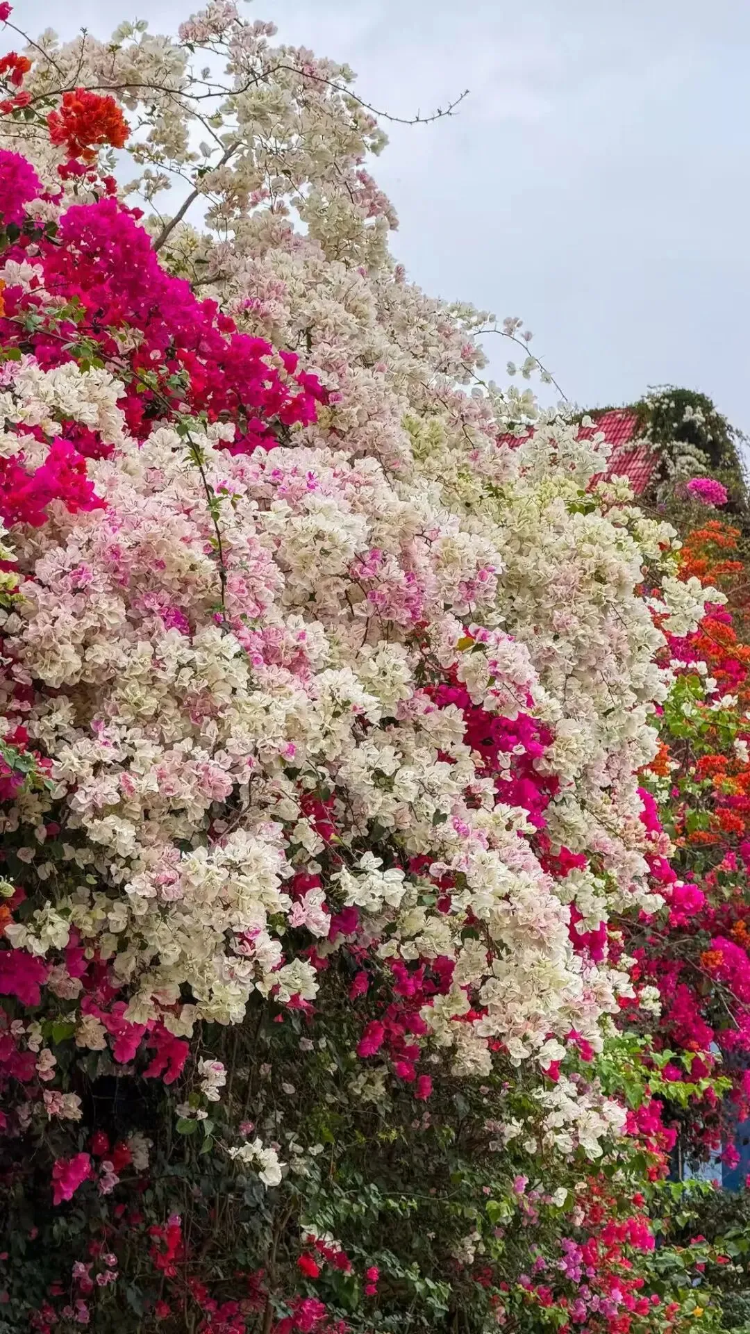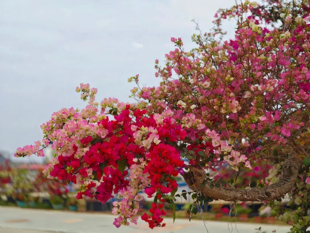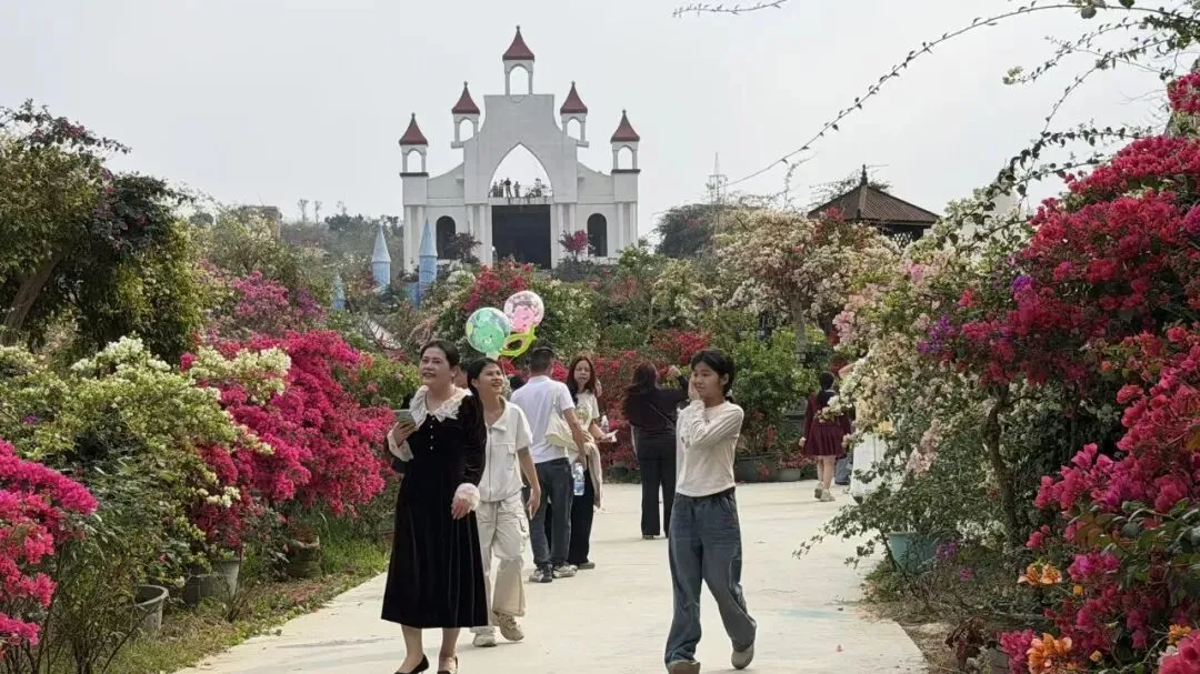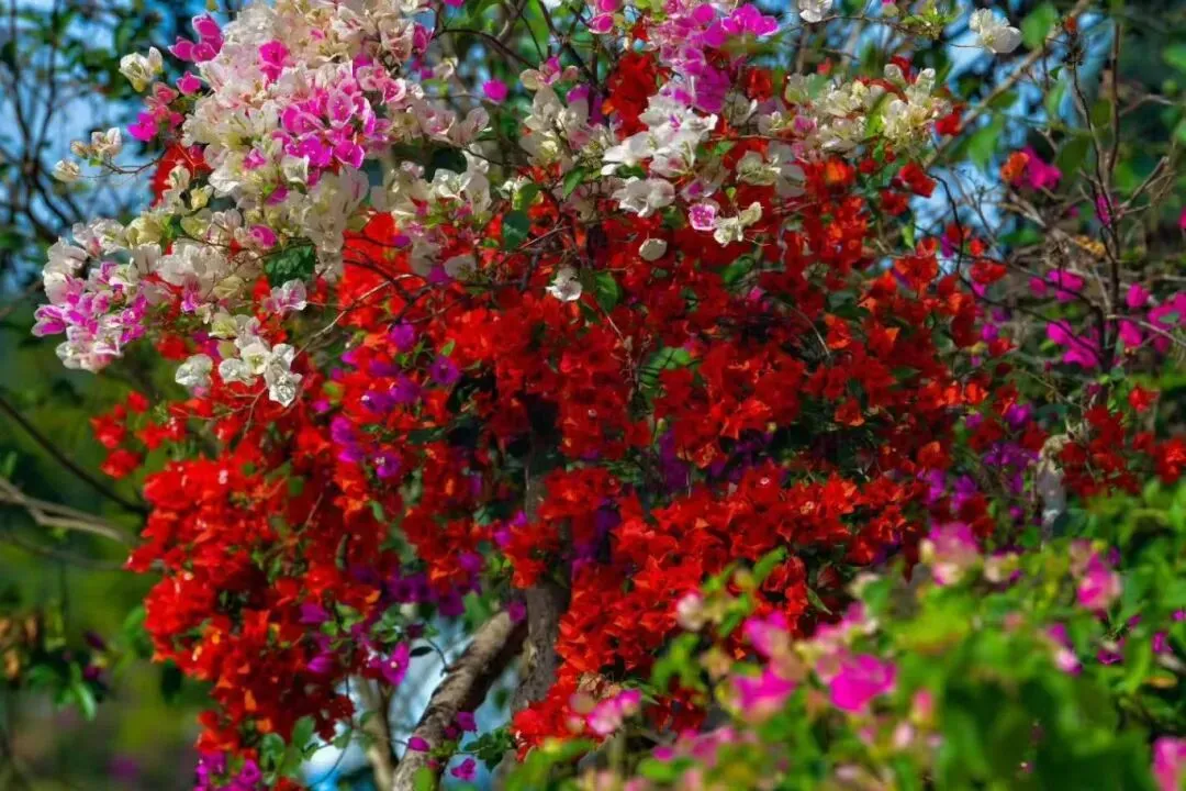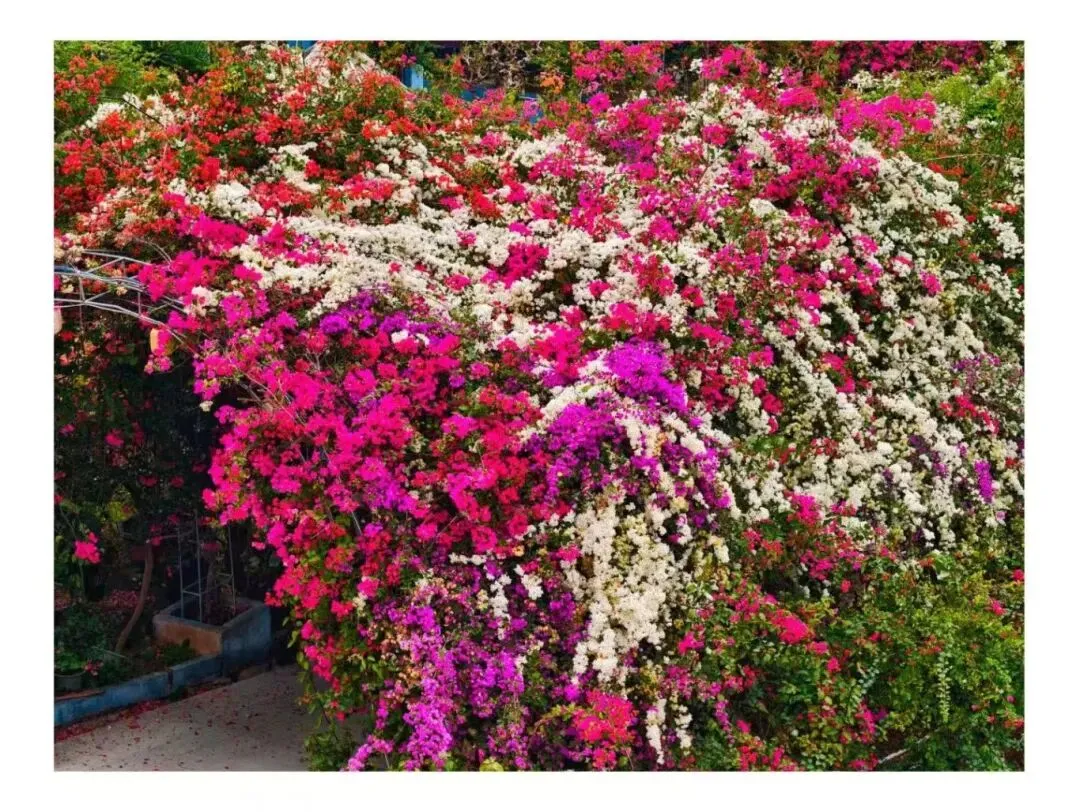 各色三角梅交织成铺天盖地的花海
