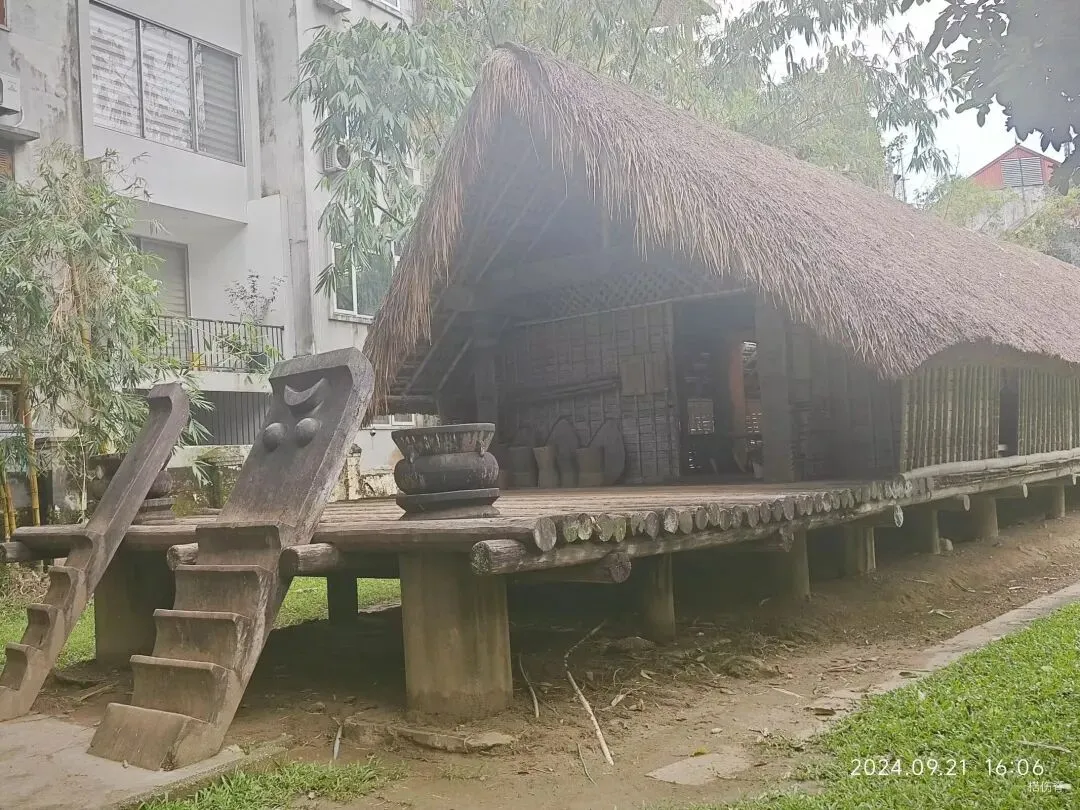 在博物馆的户外展区,我们可以看见仿建的Tây Nguyên(西原)地区少数民族dân tộc Ê Đê(埃地族)的传统民居---- nhà dài (长屋),和dân tộc Gia Rai (嘉莱族)的传统民居----nhà Rông (隆屋)。