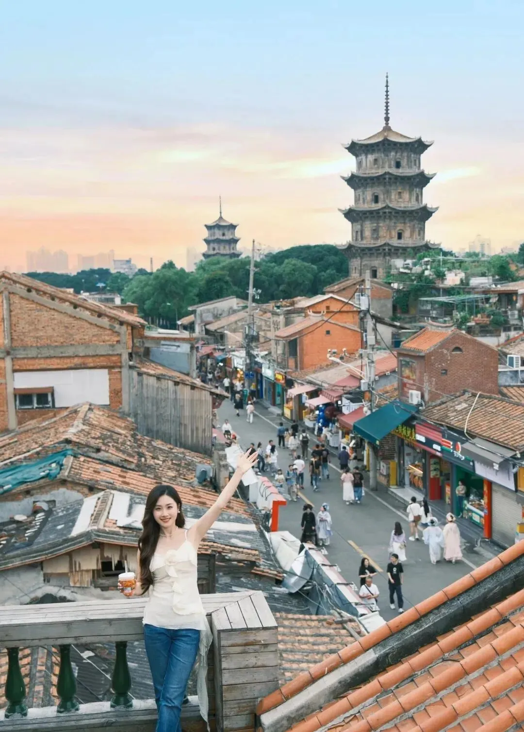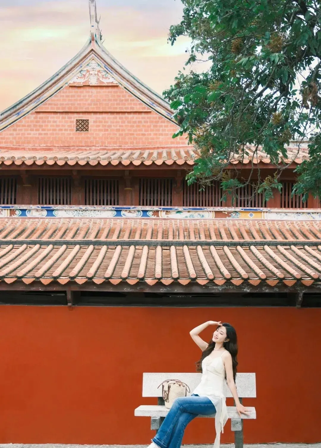 这个姿势特别适合安静的景点 , 寺庙啊、老街啊、湖边啊 , 出来的照片氛围感很足 , 不张扬但很耐看。