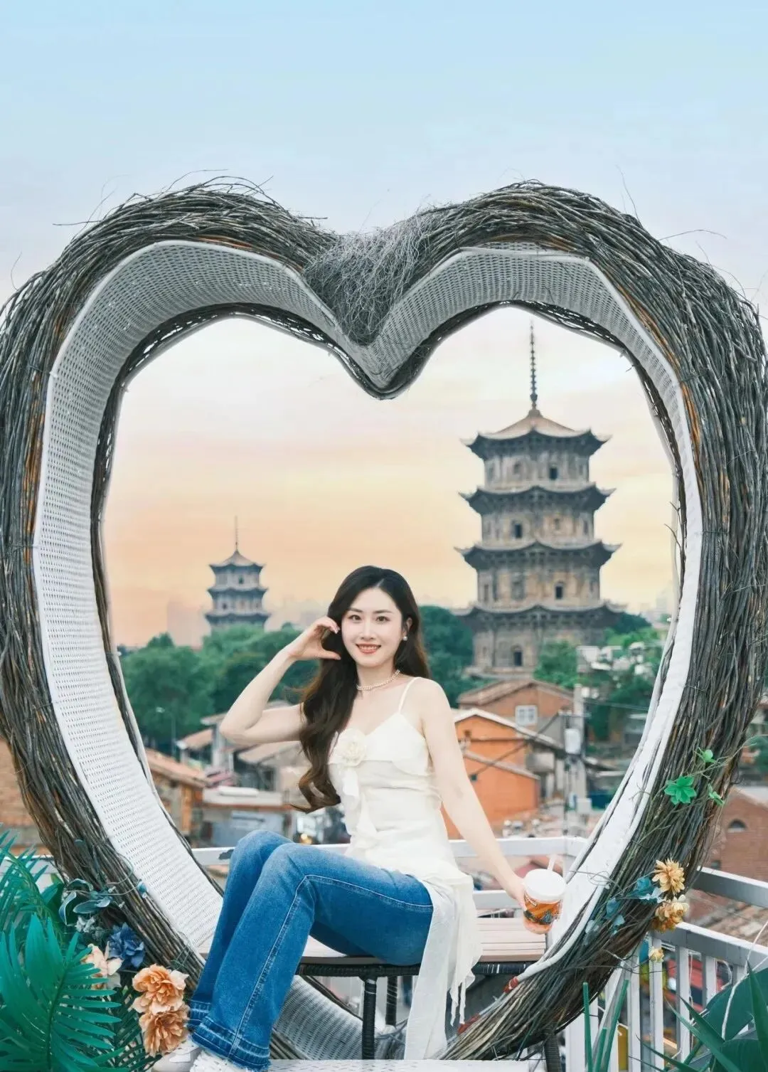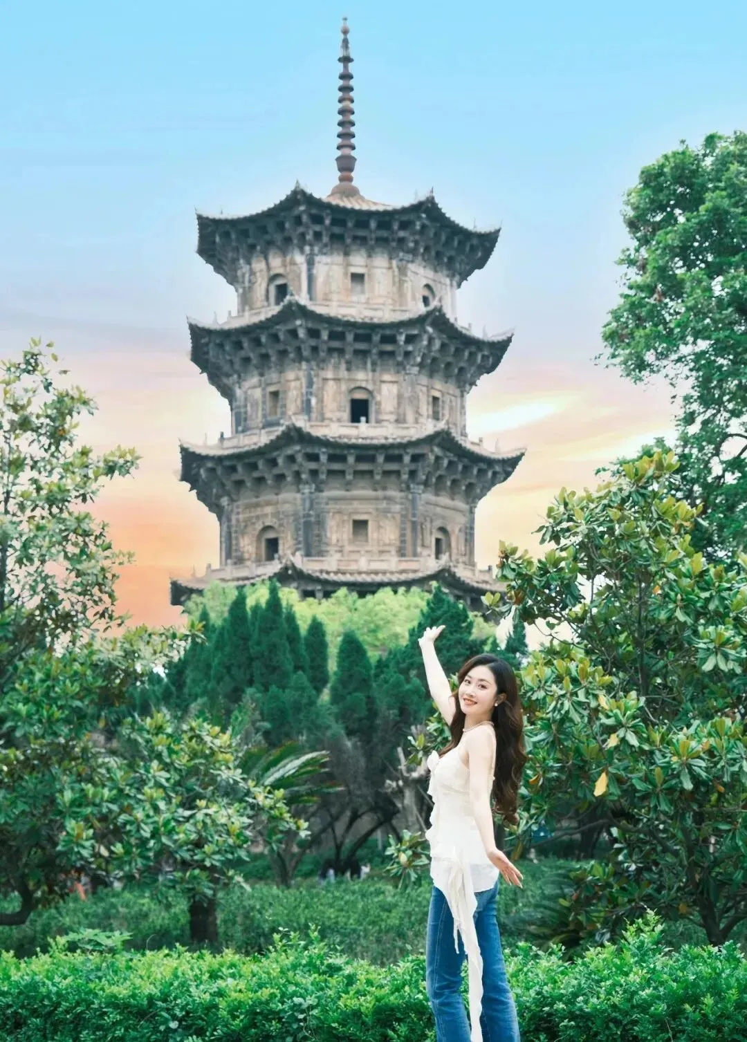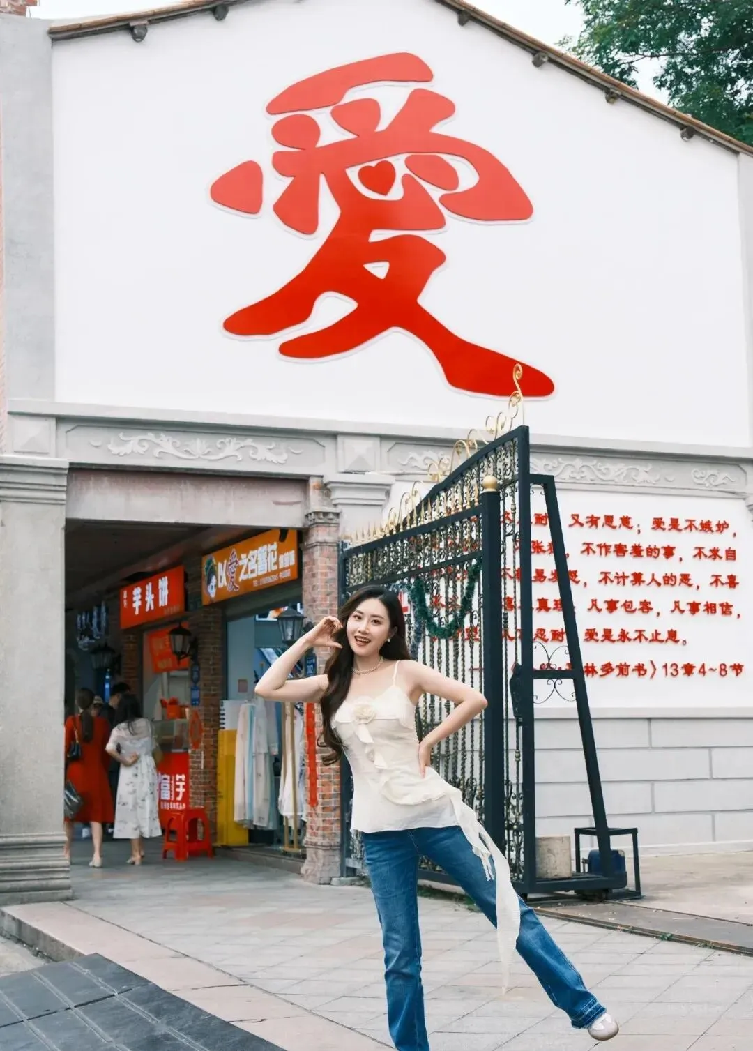 两只手轻轻抱在胸前 , 温温柔柔地笑 , 跟景点同框。