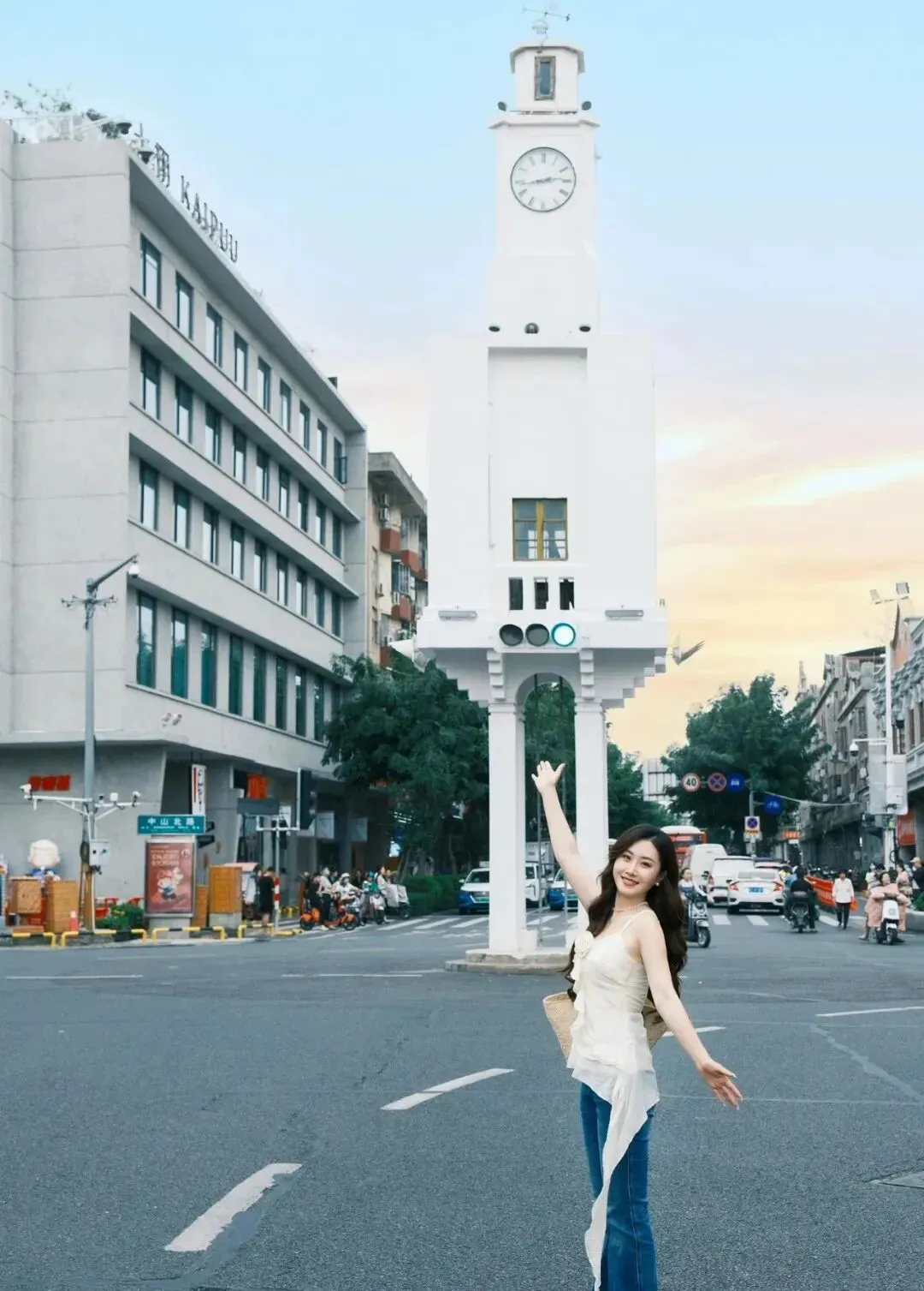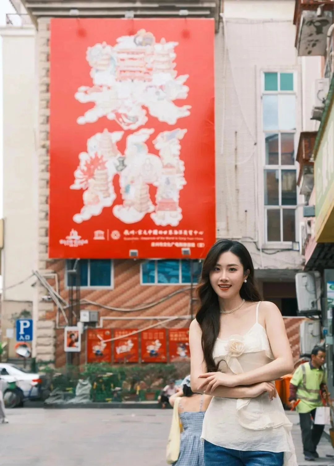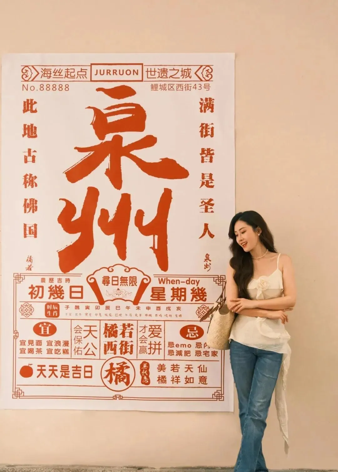 两只手轻轻抱在胸前 , 温温柔柔地笑 , 跟景点同框。