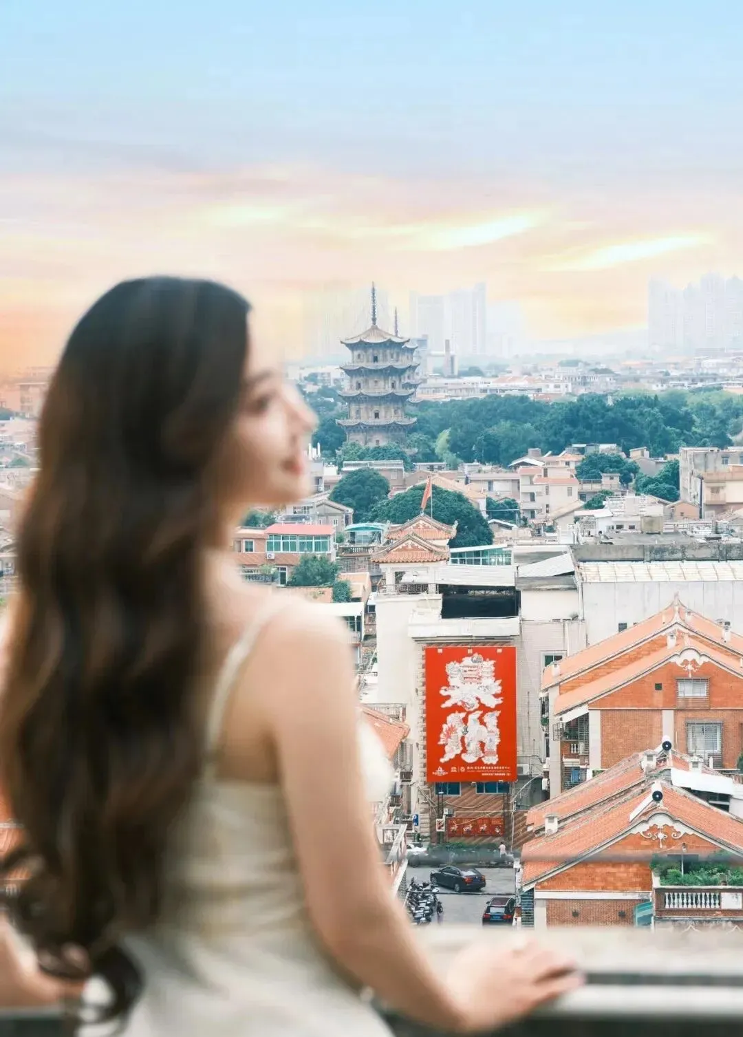 想让景点当主角?那就让摄影师把焦点放在背景上 , 人稍微虚化掉。