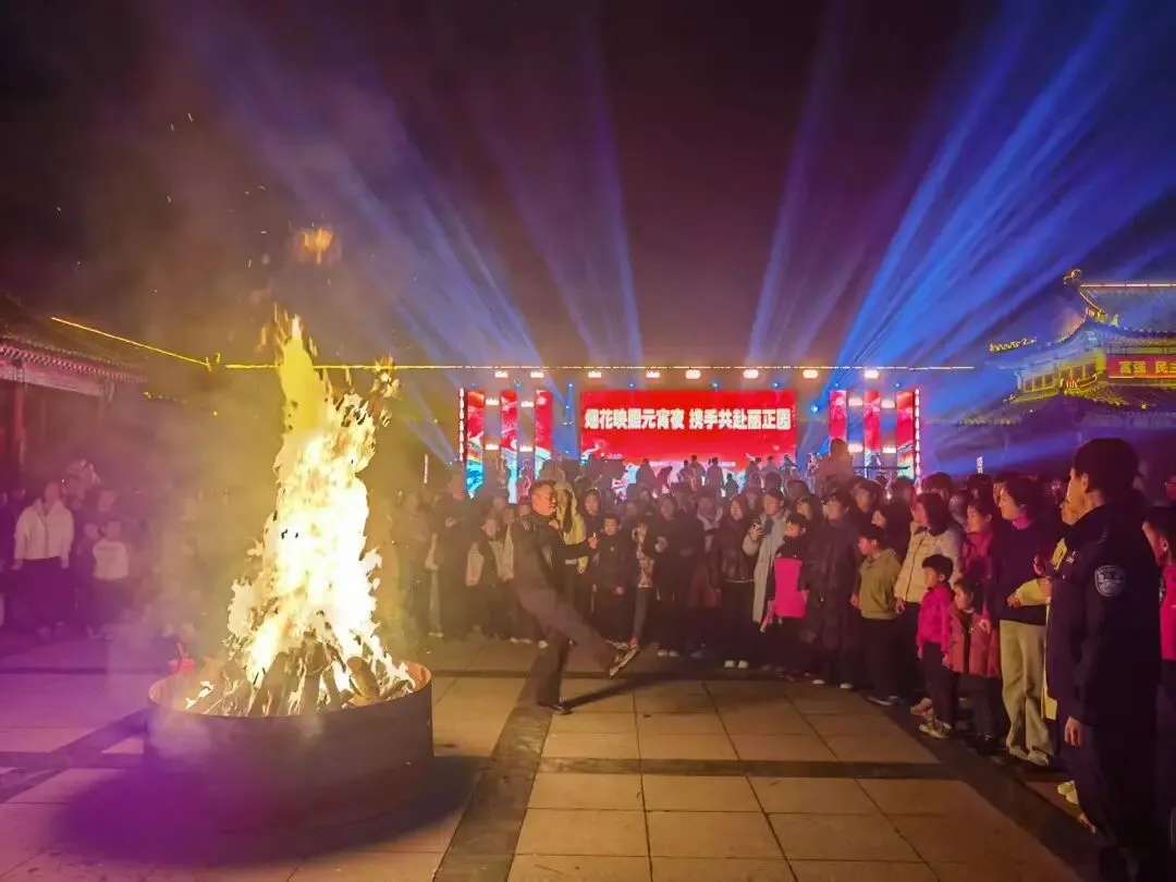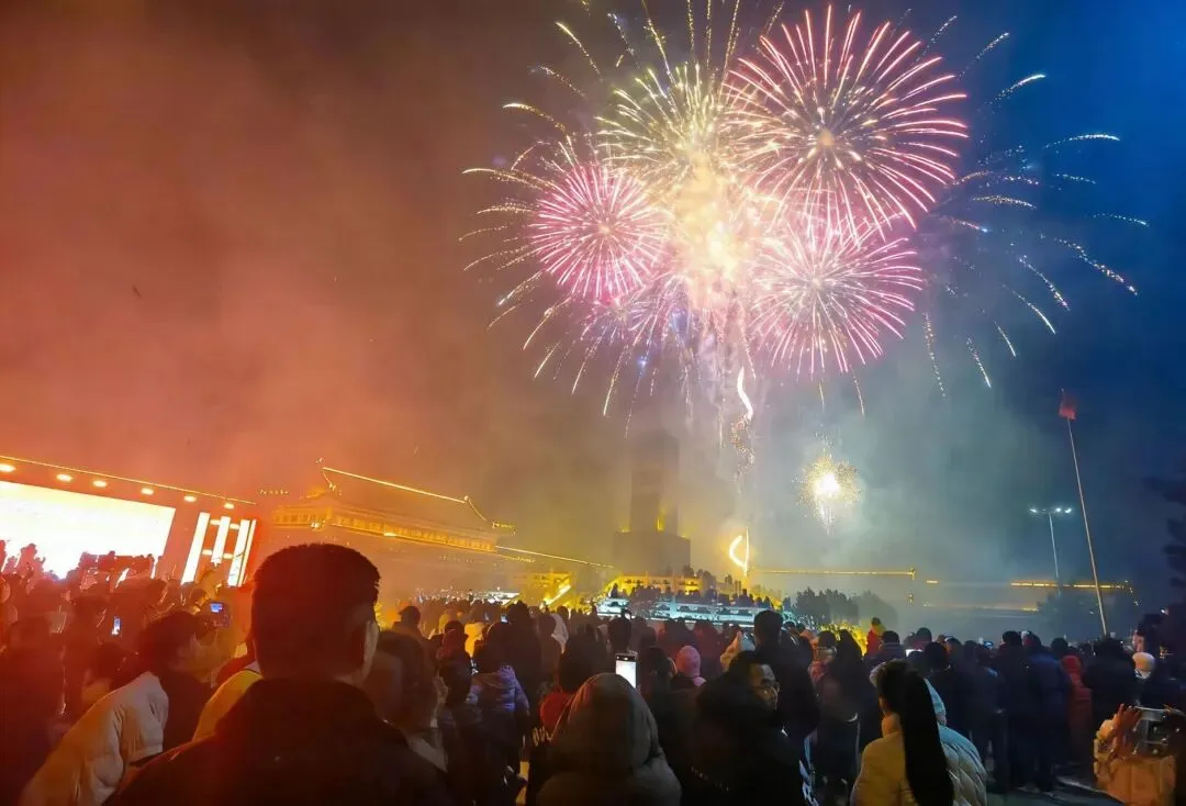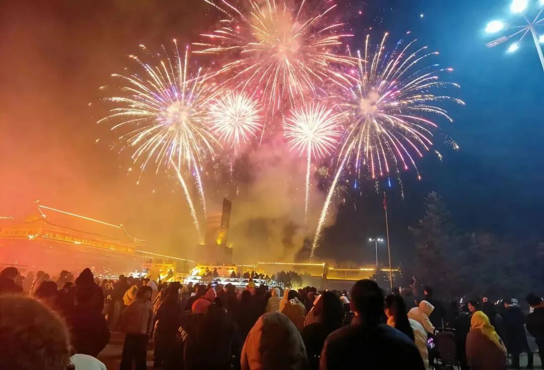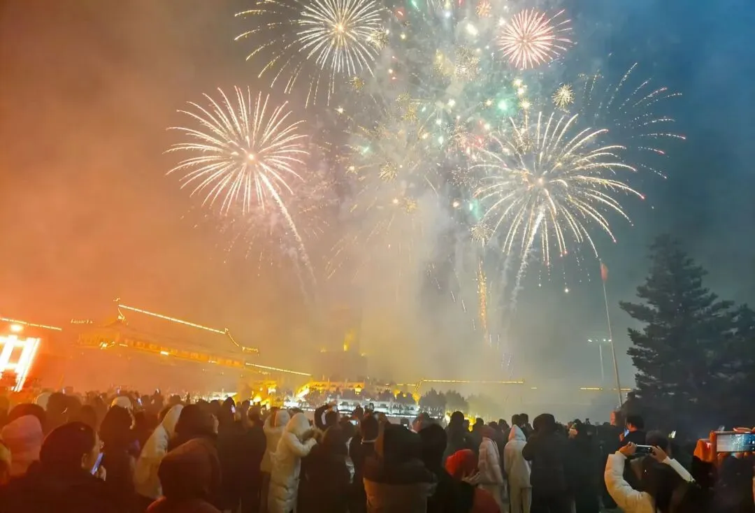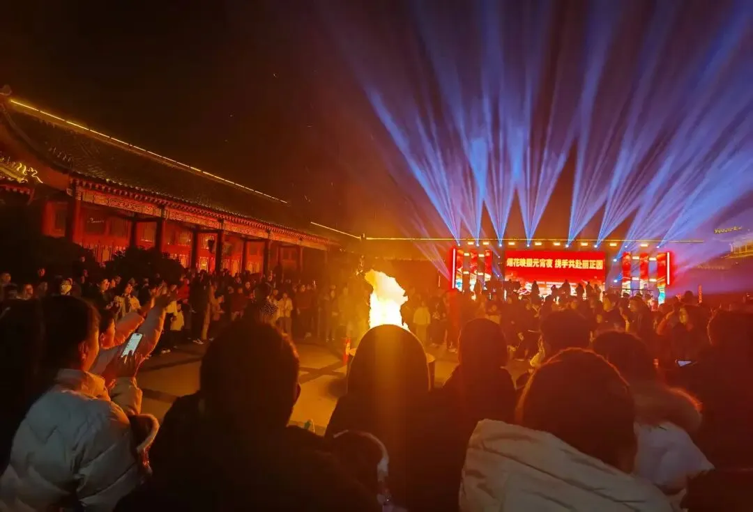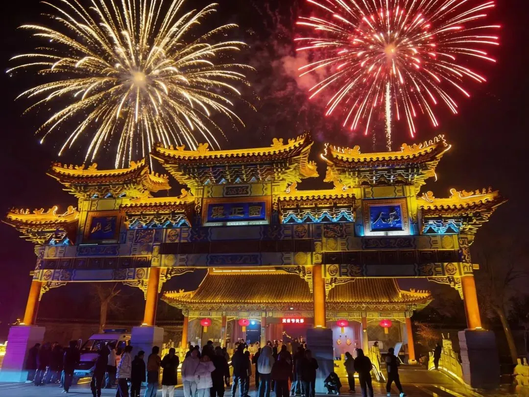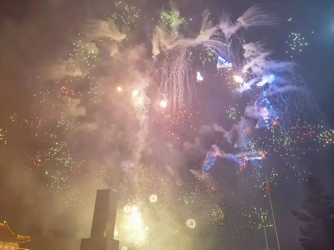 当夜幕降临,万众期待的烟花秀震撼登场!一束束烟花腾空而起,在丽正园的夜空肆意绽放,金红交错、流光溢彩,似星河倾泻、如繁花怒放,将夜空装点得如梦似幻。璀璨的烟花与景区古建、灯火交相辉映,目之所及皆是浪漫,现场游客纷纷举起手机,记录这震撼人心的绝美时刻,欢呼声与烟花绽放的声响交织,汇成最热烈的元宵赞歌。