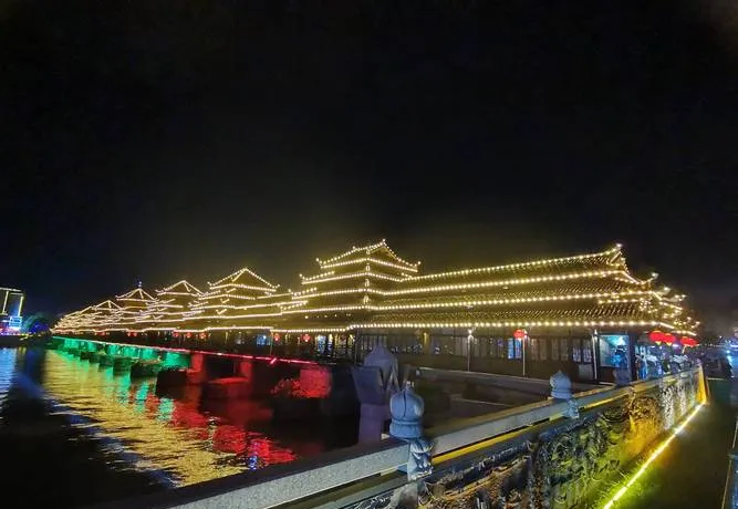 龙津风雨桥是芷江的地标,很多人来芷江第一站就是这儿,桥修得确实漂亮,侗族的建筑风格,木结构,有廊有亭,晚上亮灯之后倒映在水里,拍照特别好看。但如果你只是把它当成一个拍照点,那就可惜了,因为这座桥真正有意思的地方,不在于它有多美,而在于它代表的那种生活逻辑。