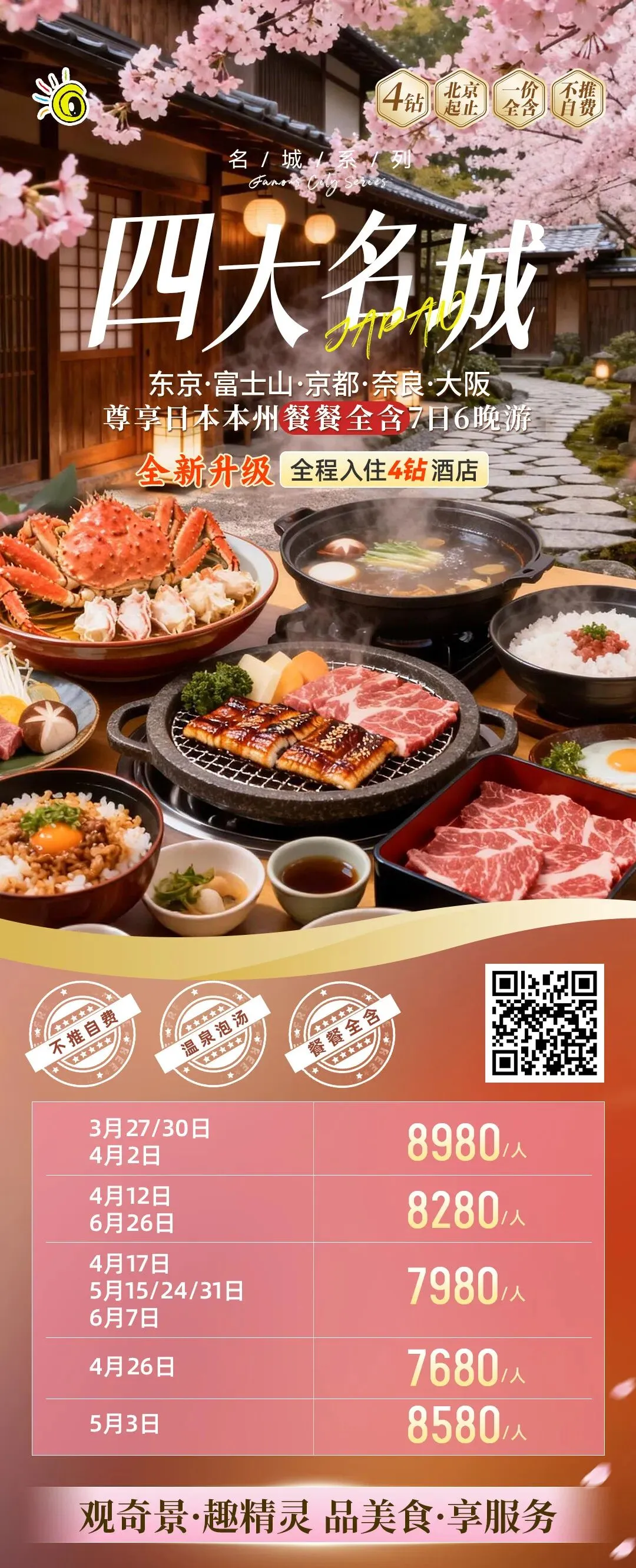#日本旅游#东京旅游#大阪旅游#富士山#富士山旅游#京都旅游#横滨旅游#本州旅游#奈良旅游#金阁寺#清水寺#忍野八海#心斋桥#道顿堀#东京银座#浅草寺#秋叶原#奈良神鹿公园#台场#大阪城公园#东京塔#祗园花见小路#神户渔人码头#道顿堀美食街#东京广场#富士山五合目#秋叶原动漫街#河口湖樱花长廊#千鸟之渊#上野公园#日本赏樱花#富士山樱花#北京去日本旅游团 (欢迎企业、团队包团定制)
