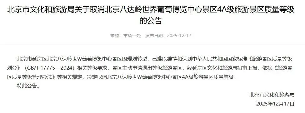 唯一有变化的是,2025年12月,因规划转型,北京八达岭世界葡萄博览中心主动申请退出4A级景区等级,已被北京文旅局取消资质。