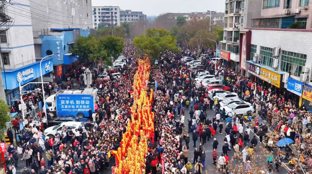 同样吸睛的还有这只长达30米的大虾,在40名舞虾人的默契配合下,上下舞动,与4只小虾组成的巡游队伍,穿梭于古城。一路走,一路赏,跟随队伍来到樱花大道,花鼓声声萦绕古城,男女演员身着特色服饰,演绎经典的花鼓《花鼓迎春俏》,唱词婉转、舞步轻快,浓浓的乡土生活气息扑面而来;40名腰鼓队演员身着红衣,鼓点整齐有力,红绸翻飞如霞,尽显向上活力。