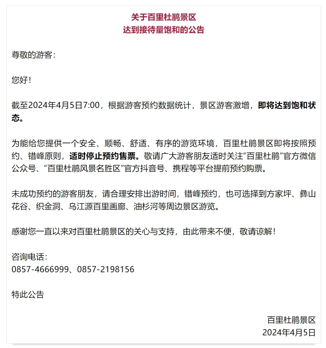 今天上午7时,贵州百里杜鹃景区再次发布公告表示:因游客激增,景区将适时停止预约售票。