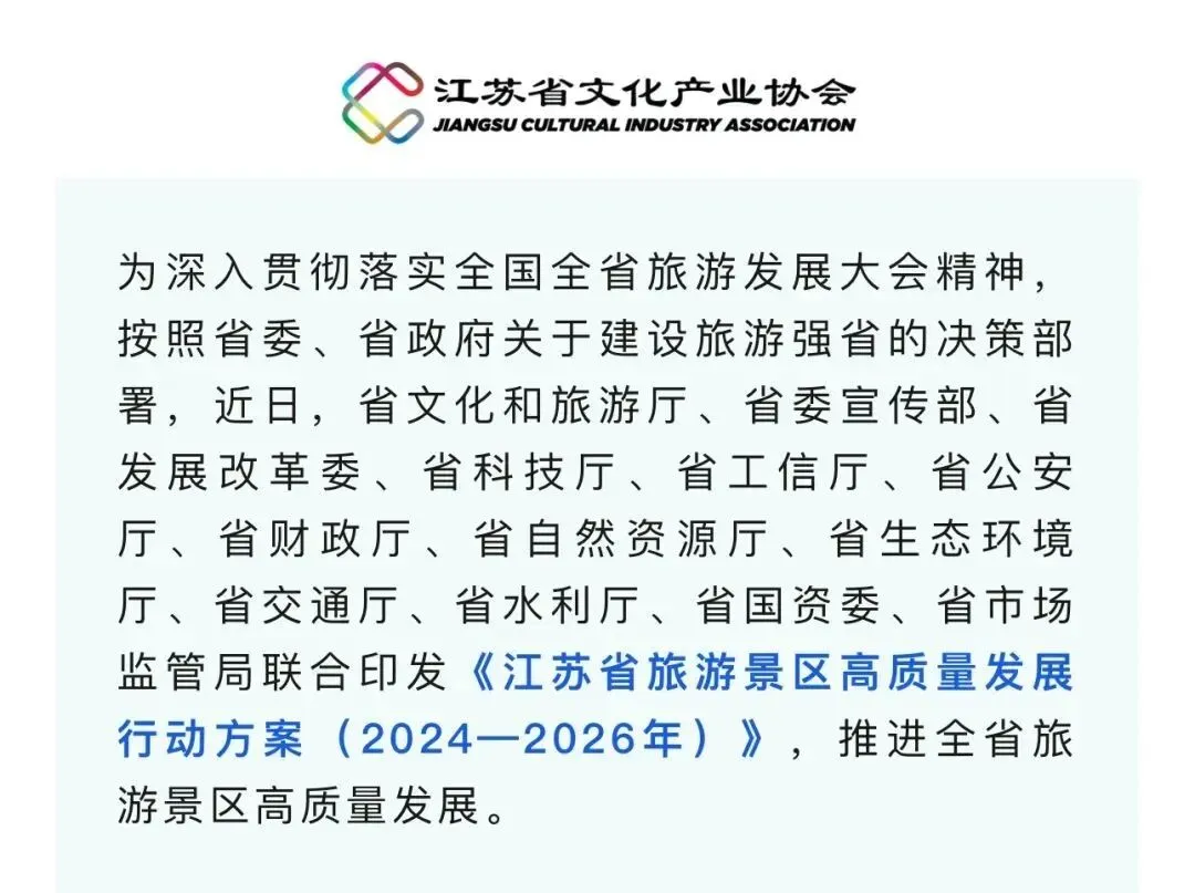 您现在的位置是:首页 > 国内旅游目的推荐 > 正文 国内旅游目的推荐 《江苏省旅游景区高质量发展行动方案(2024—2026年)》发布 admin2026年03月04日 15:51:39国内旅游目的推荐2 《江苏省旅游景区高质量发展行动方案(2024—2026年)》发布资料来源丨 江苏文创新视野 仪征枣林湾旅游度假区©版权声明:本文版权及观点属原作者所有,本平台只做交流分享,如有侵权请及时联系我们,我们将第一时间删除,转载请注明作者及原出处。 转载请说明来源于"旅荐网",部分内容转载自网络,如有侵权请联系qlwl@foxmail.com删除 本文地址:https://www.15386.cn/post/132562.html 上一篇 人圆月圆,相遇上元!来三亚千古情景区欢乐闹元宵! 下一篇 【我要上热门】家/旅行住在景区(或附近)是什么体验? 相关文章 新出炉的2026年3月全国免票景区分享给你! 每次回来都是去不一样的景区! 【我要上热门】家/旅行住在景区(或附近)是什么体验? 人圆月圆,相遇上元!来三亚千古情景区欢乐闹元宵! ¥439起含神仙居门票!住仙居景区旁酒店,周末不加价,五一补差200 随州这些景区,限时免票/半价/优惠! 春风赴芳华,仙女醉山水|女神节来三爪仑景区,赴一场春日之约! 随州这些景区,限时免票/半价/优惠! 超全名单!降至三级后,北京这些景区即将开放啦! 2026女神节专属福利!全国百大景区免费开放,这份“宠粉”攻略请收好! 发表评论 取消回复 评论列表 这篇文章还没有收到评论,赶紧来抢沙发吧~