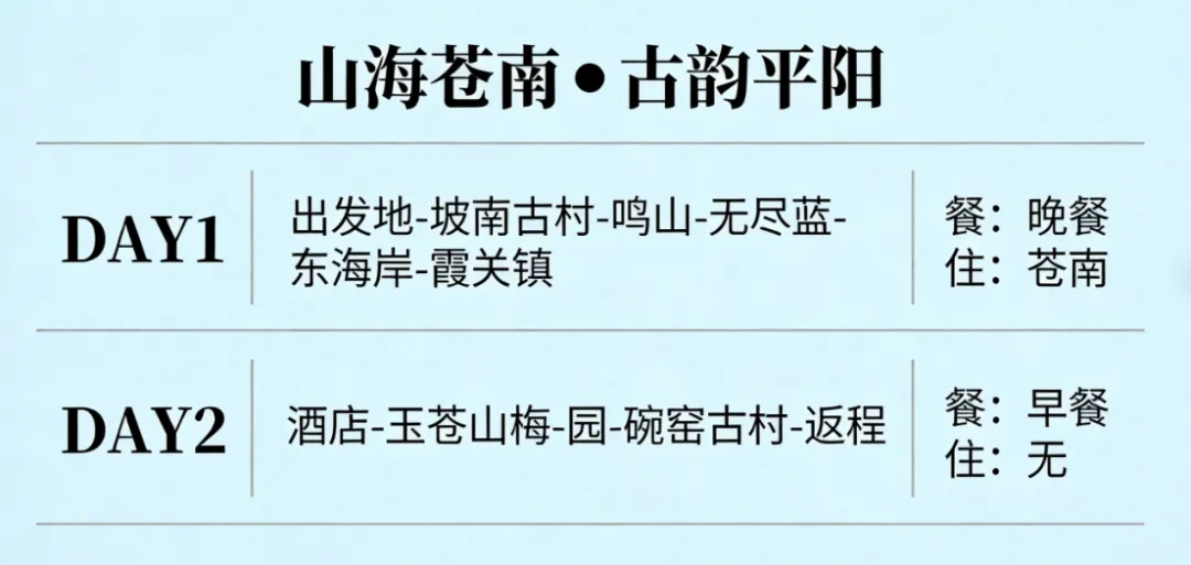 第一天:早上连江指定点集合,前往平阳(车程约4小时),游览【坡南古村】(游览约1小时)平阳坡南位于浙江省温州市平阳县,是一个充满人文底蕴和江南水乡风情地,这里保留了最原始的古镇风貌。坡南全长约1.5公里,街道两旁保存完好的明清建筑风格独特,具有浓郁的南方特色。街道上弥漫着浓厚的人间烟火气,小河贯穿古村,两岸古民居保存完好,石板桥和石拱桥连接两岸,桥上、河边走廊上悠闲的当地人构成了一幅美丽的画卷.后前往小乌镇【鸣山】(车程约20分钟,游览约1小时)鸣山是一个充满历史文化和自然美景的小众旅游胜地,游览【古民居建筑群】鸣山村的古民居保存得相当完好,青砖黛瓦、飞檐翘角,漫步其间仿佛能听到历史的回声.游览【“无尽蓝”观景平台】(车程约1小时,游览时间约30分钟)坐落于马站镇兴岙村,地处于“中国东海岸1号公路”——168黄金海岸的南段。在逐渐升温的天气里,吹着海风,眺望远方,山海一览无余。后游【东海岸一号公路】(车程约30分钟,游览时间约30分钟)霞关镇其中一段,公路全长168.8公里沿海湾蜿蜒曲折,随山形上下起伏跌宕,远眺窗外是蓝蓝的天空蓝蓝的大海……中国东海岸一号公路被誉为中国最美的海岸线公路。打卡“无尽蓝”观景平台,坐落于马站镇兴岙村关头段,地处于“中国东海岸1号公路”——168黄金海岸线的南段,项目总投资约700万,建筑面积6亩,距离马站镇城区7.7km,离渔寮风景区5.5km。从入口往里探去,映入眼帘的便是蓝白相间的建筑物,照应着蓝天、白云和大海,风景独特。游览【霞关镇5A景区】(车程约20分钟,游览时间1小时)进入霞关镇,迎面扑来的蓝白异域风情已经赚足眼球,素有圣托里尼的美誉。是浙江省最南端的滨海集镇,是苍南最大渔港批发这里可以购买新鲜的海鱼。苍南的霞关镇有一段最美公路,全长2.51公里,总投资2000万元,以蓝色港湾、滨海风情为主题,以景观节点打造和建筑立面整治为重点,结合场地现状,充分挖掘小镇滨海文化,打通山海景观视野走廊,融合山海岛屿,凸显霞关特色,真正打造以霞映海、以海映城、山城相依的边城景观接团后游览世界矾都。后面入住酒店休息。入住后推荐自由活动 【渔寮大沙滩】渔寮沙滩4A级景区,景区山地自北向南走向,西北青山环抱,苍松翠绿。沙滩海面辽阔,平时海面风平浪静,碧波荡漾,最适宜人们游泳。即使向沙滩外走出上百米,海水只是淹到你的胸部。仰身躺在海面上,倾听扑面而来阵阵波涛特有的节奏,你将为之陶醉。渔寮沙滩平坦宽广,就像一条平铺着的地毯,走在上 面柔滑而硬实。虽然看起来沙面似乎总是积着一层浅水,但人走在上面连鞋底都不湿。躺在沙滩上享受日光浴,你将忘记什么是疲劳,什么是忧愁。宜人的气候,宽广的沙滩、奇异的礁石,蔚蓝的大海,天然的岛屿,这些美丽的元素造就了独特的滨海风情.(备注:入住酒店在渔寮大沙滩旁边,自由活动项目,无导游。)02酒店--玉苍山-梅园-碗窑古村--返程 餐:早餐 住:无 早餐后,苍南赴国家4AAAA级森林公园——【玉苍山】(车程约1小时,游览时间约2.5小时)这里山势高峻,林木茂密,以石海奇石、山顶平湖为特色,集奇、幽、秀、野于一体,是一个与其他风景区风格迥然不同的国家森林公园和省级旅游胜地,2000年被评为温州市十大名胜景点之一。后前往【梅园】(车程约1小时,游览约1小时)梅花盛开,十里芬芳,梅园因而得名.后前往游览东方夏威夷之的【碗窑古村】(车程约1小时,游览时间约2小时)碗窑古村落,位于桥墩镇碗窑村。 整个村子有几百年历史,村中的房子依山而建,一条条蜿蜒的山道将一家一户串连起来,清朝初年的 商城富锦北戴河万吊脚楼、二层高的小木楼错落有致形态各异,仿佛一条藤蔓上左一朵右朵缀满的花.几百年的时光匆匆 乐湾仔邹城禄而逝,村道的石板被磨得光可照人,来回穿梭的商人也不见踪影,只有老戏台、旧客 祖师庙店还在村中静静地矗立,向我们这些外来的游客讲述着曾经的繁华与鼎盛。制碗手艺仅有的一家,他们还 白龙庙保留着古老的制碗作坊,游客花上十元钱,可以用泥坯做一回碗,虽然纯粹是为好玩,不过你一本正经地玩着泥巴,那种与泥土亲近的感觉确实令人陶醉。适时结束愉快的旅程,乘车返回温馨的家。(车程约3.5小时)