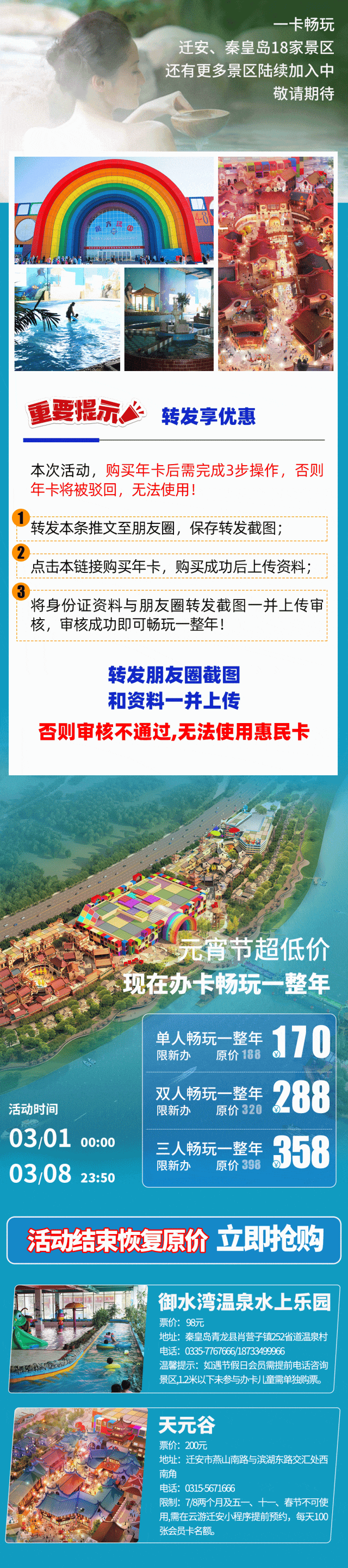 二、购买成功后,请务必将身份证、本地证明(外地居民)等相关资料在活动期间内上传,否则审核不通过!影响您的出行计划;