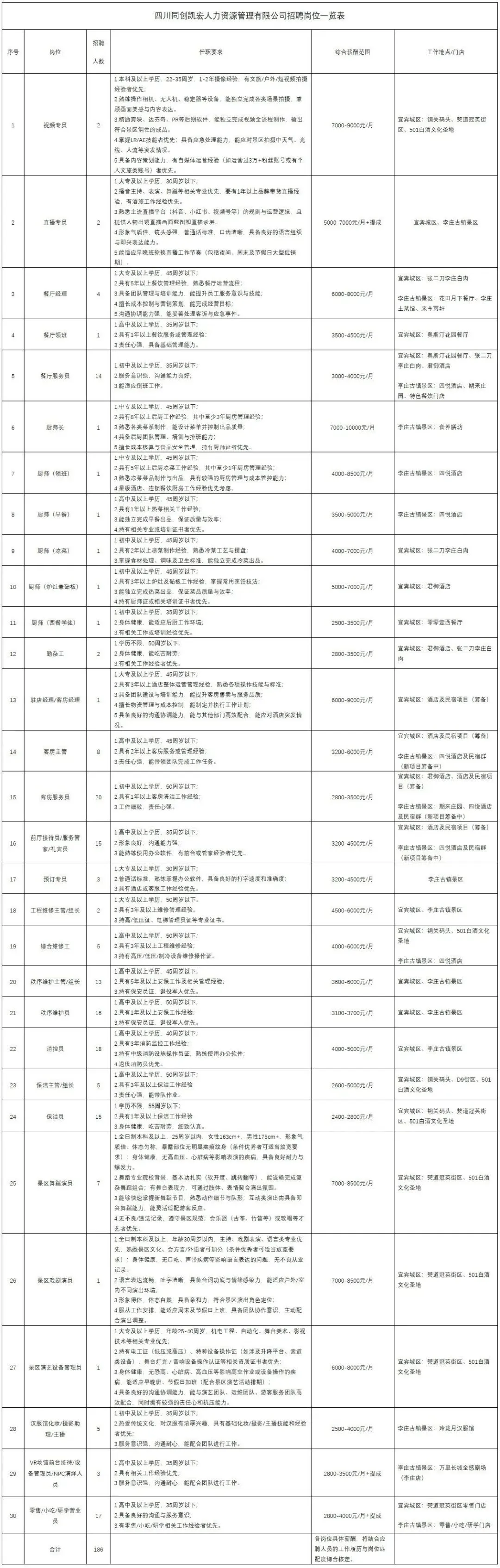 四川同创凯宏人力资源管理有限公司(以下简称“公司”)成立于2016年,专注于为客户单位提供专业的劳务派遣和人力资源管理外包服务,拥有正规的劳务派遣资质。现受宜宾翠旅投集团有限公司委托,面向社会公开招聘186名文旅一线运营岗位人员,派遣至翠旅投集团下属公司运营管理的宜宾城区僰道冠英街区、501白酒文化圣地、铜关码头以及李庄古镇月亮田景区工作。