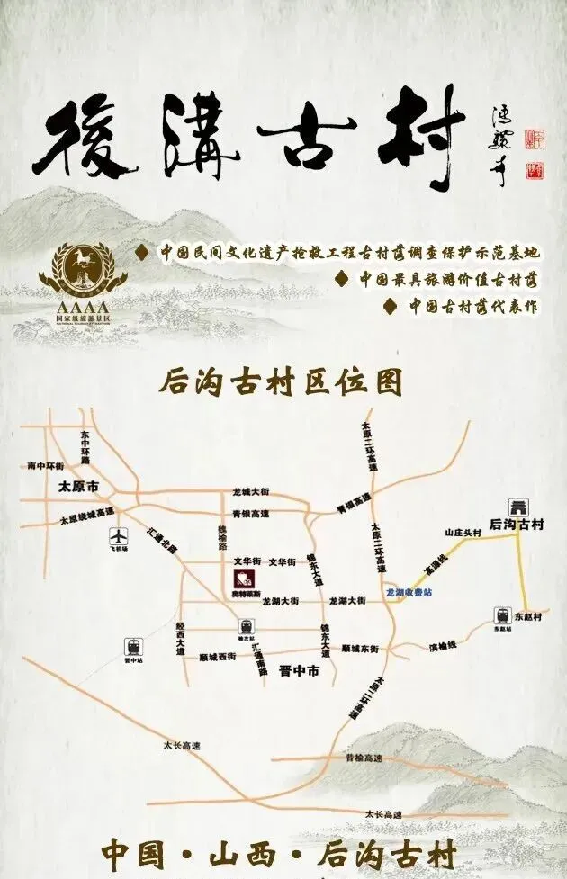 路线1:走高速车辆从太原二环高速榆次龙湖收费站出口,左转沿331县道前行约5Km,至Y099旅游专线直达后沟古村游客中心停车购票入园。