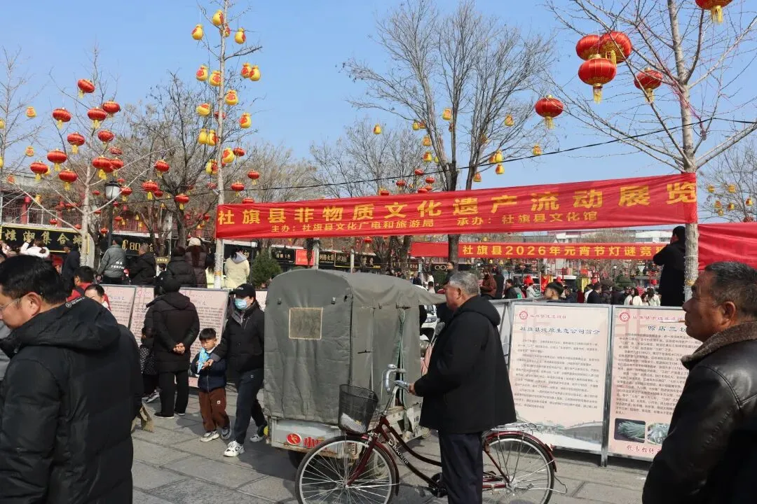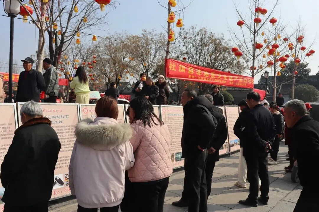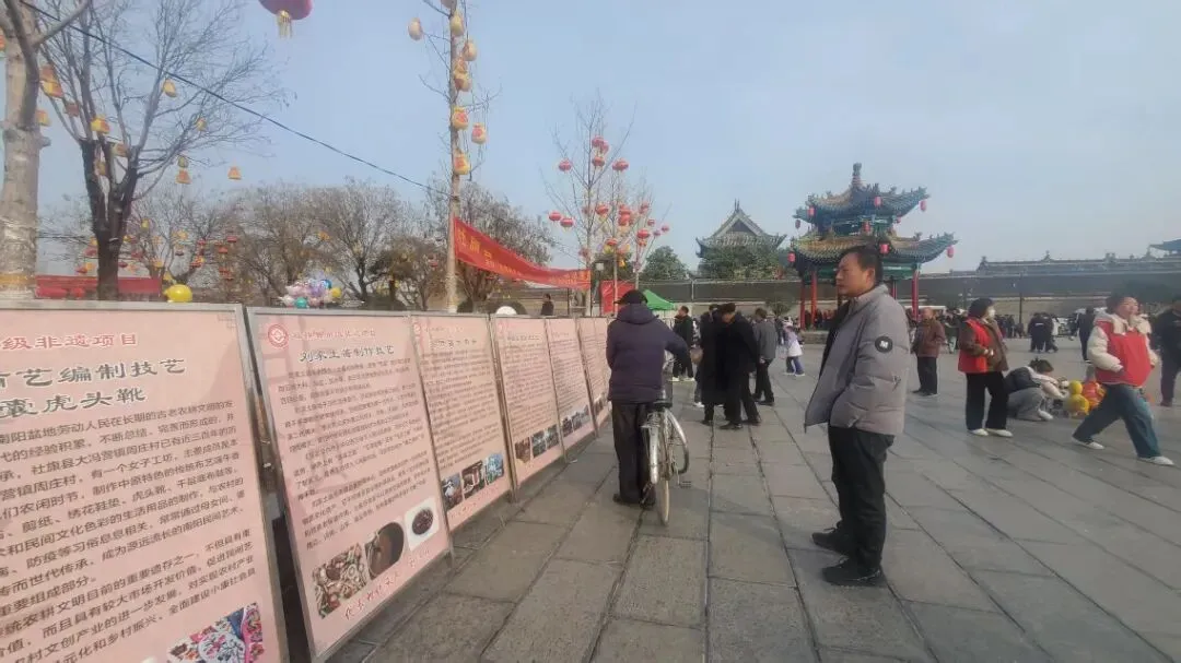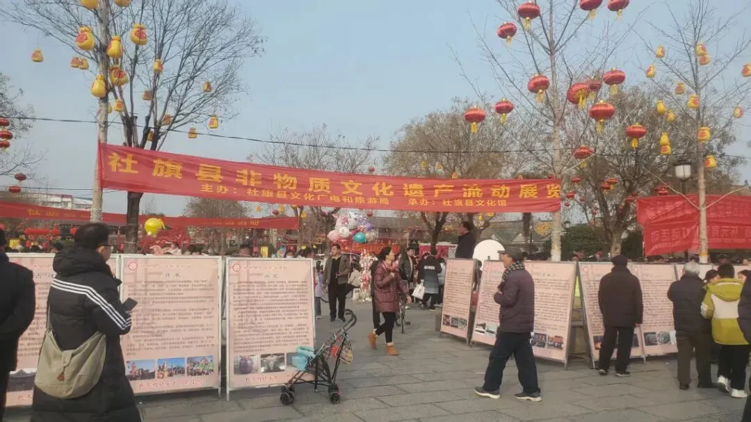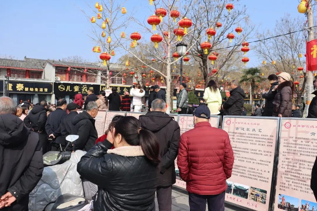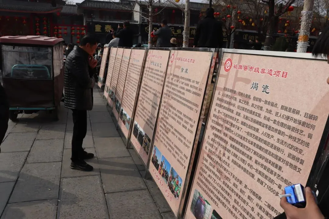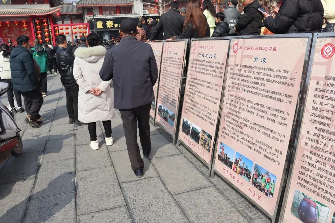 3月3日,由社旗县文化广电和旅游局、县文化馆主办的非物质文化遗产流动展,在赊店古镇山陕会馆景区拉开帷幕。展览以图文展板形式,一块块图文并茂的展板沿步道排开,将陈氏木版年画、赊店三粉制作技艺、葫芦烙画等数三十余项省、市、县级非遗项目的历史渊源、工艺细节、传承人故事生动呈现,让往来游客在游览古建筑群的同时,沉浸式触摸本土非遗的温度与厚度。