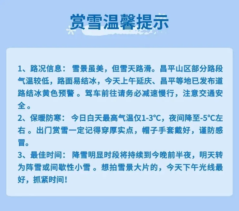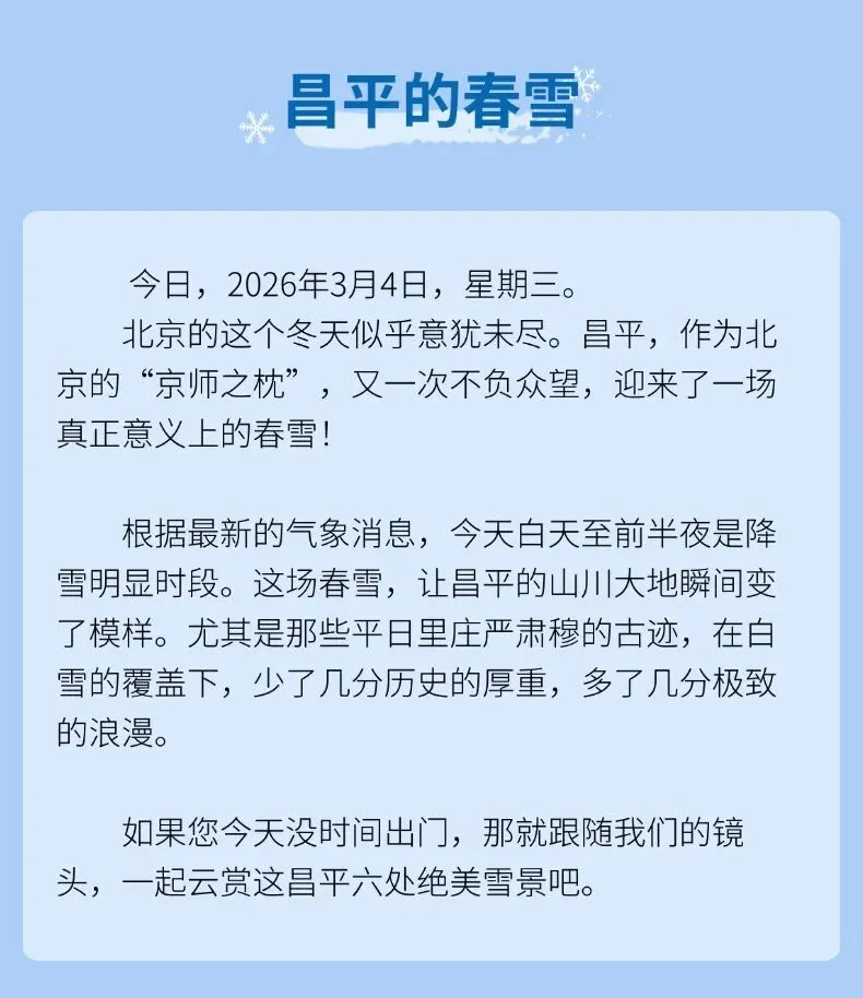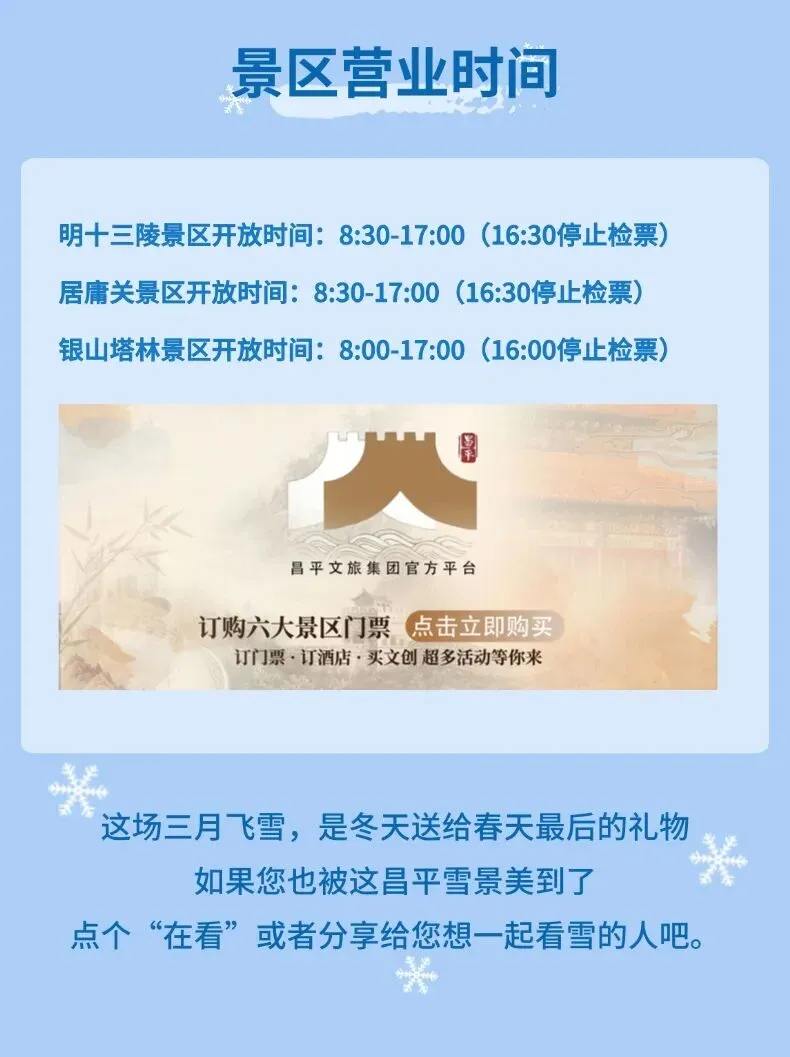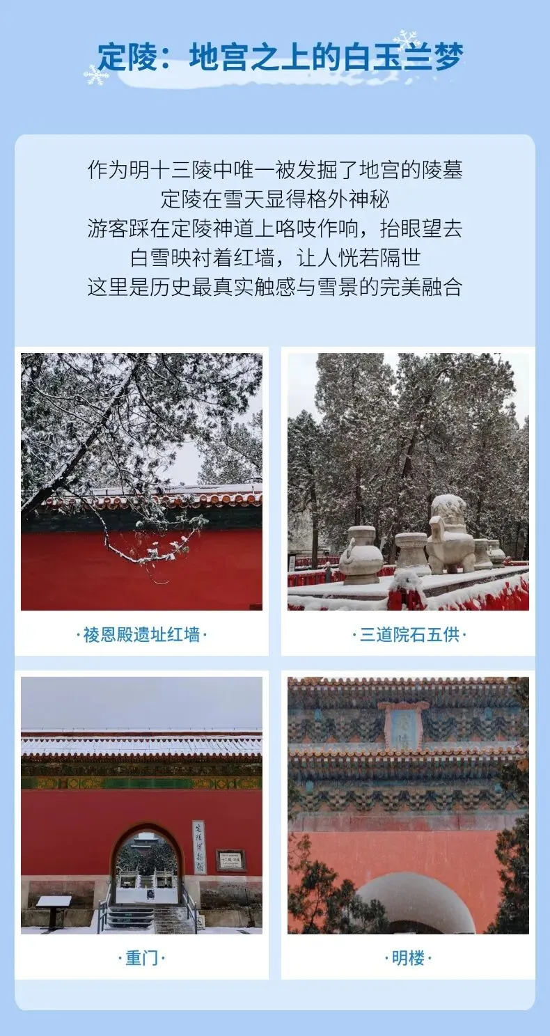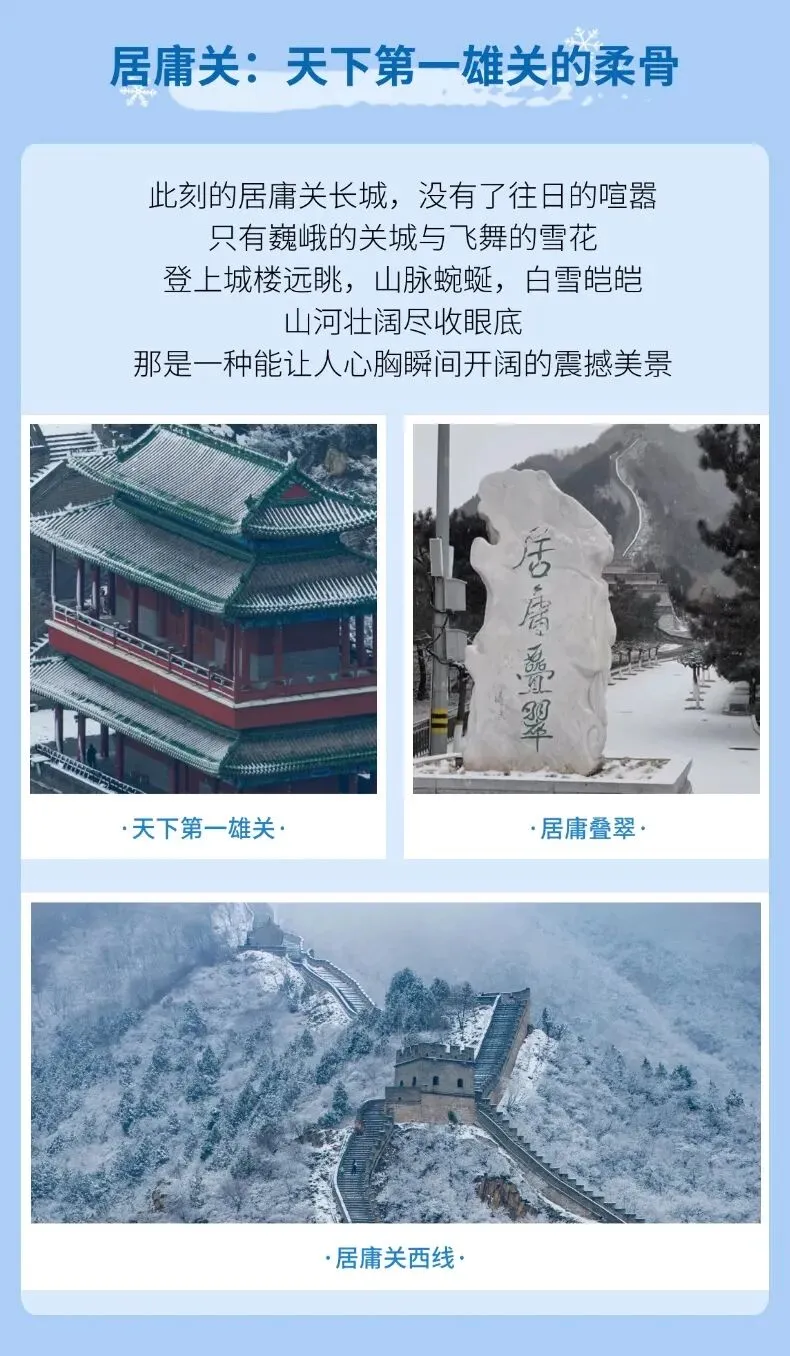 您现在的位置是:首页 > 国内旅游目的推荐 > 正文 国内旅游目的推荐 今日昌平六大景区雪后实拍:明十三陵肃穆、居庸关巍峨、银山塔林听禅…美得刚刚好 admin2026年03月04日 18:40:47国内旅游目的推荐2 今日昌平六大景区雪后实拍:明十三陵肃穆、居庸关巍峨、银山塔林听禅…美得刚刚好 转载请说明来源于"旅荐网",部分内容转载自网络,如有侵权请联系qlwl@foxmail.com删除 本文地址:https://www.15386.cn/post/132710.html 上一篇 豫南宝藏景区•西九华山 下一篇 四明山景区内度假【浙江余姚丨仰天湖山庄】3天2晚398元/人起●含2早4正+四明山国家森林公园门票●享免费棋牌●免费K歌 相关文章 山里泉景区开园公告 开春赏三花!这个年卡景区集齐十色禾雀花、七色油菜花、多彩格桑花... ... 沈阳三大景区免费畅游!这些人可以领票! 丽江金塔景区 妇女节 | 窦圌山景区邀您共赴春日之约,当天所有女性免票入园! 【1077早知道】陕西多地景区推出妇女节游览优惠活动 普者黑景区的桃花开了 《景区光环境(质量)评价指标》团体标准全文正式公布 王岗坪景区滑雪场闭园通知 智慧交通赋能景区:用科技重构“出行体验”新范式 发表评论 取消回复 评论列表 这篇文章还没有收到评论,赶紧来抢沙发吧~