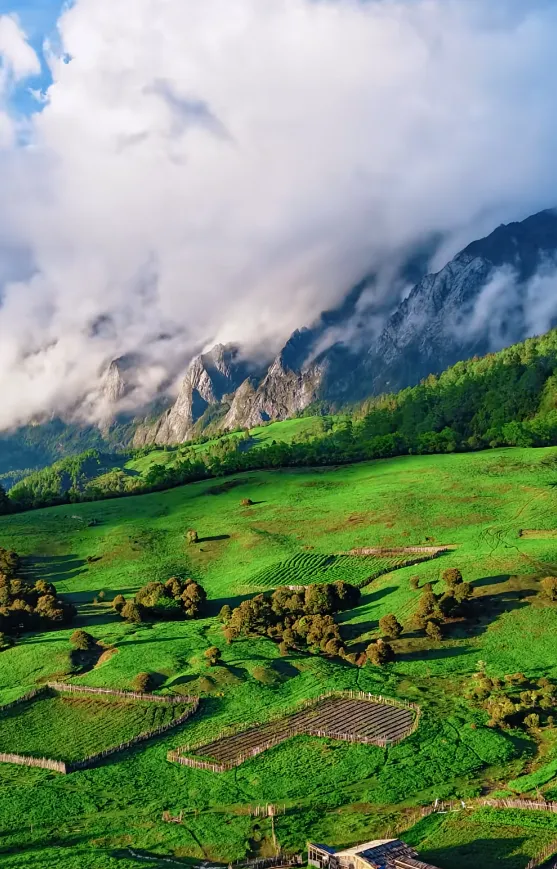 这里是被时光轻轻藏起的秘境。它是阿尔卑斯山遗落在滇西北的明信片,藏在群山褶皱里的一片绿野,云影漫过草甸,林海铺向天际,高山牧场在云雾间时隐时现。