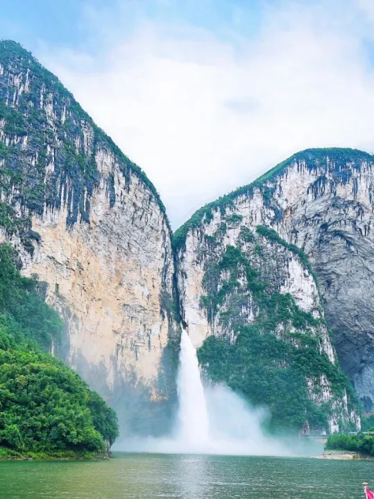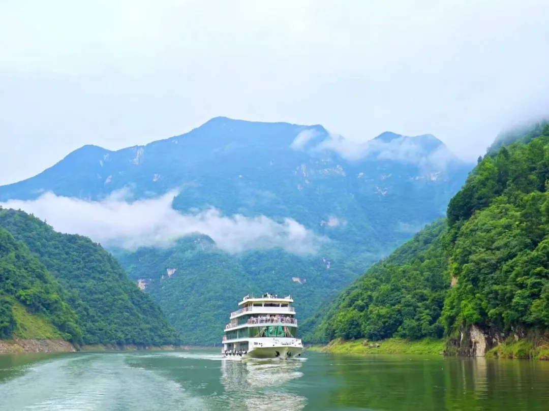 船行碧波上,转过峡谷的刹那,整座蝴蝶崖豁然展开——两百米高的崖壁天然成蝶,两翼舒展、脉络分明,静立于江面,仿佛下一秒就要振翅飞入云天。